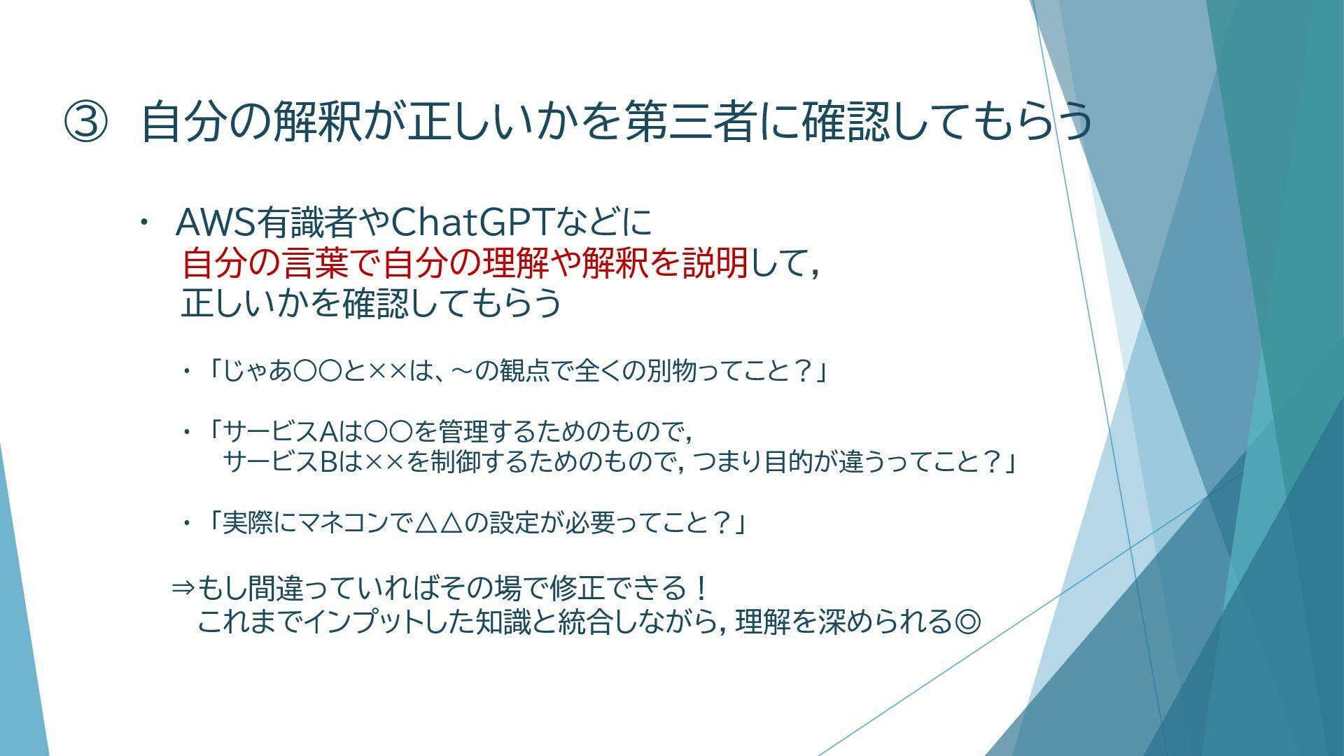 ③ 自分の解釈が正しいかを第三者に確認してもらう ・ AWS有識者やChatGPTなどに 自分の言葉で自分の理解や解釈を説明して, 正しいかを確認してもらう ・ 「じゃあ◦◦と××は、~の観点で全くの別物ってこと?」 ・ 「サービスAは◦◦を管理するためのもので,