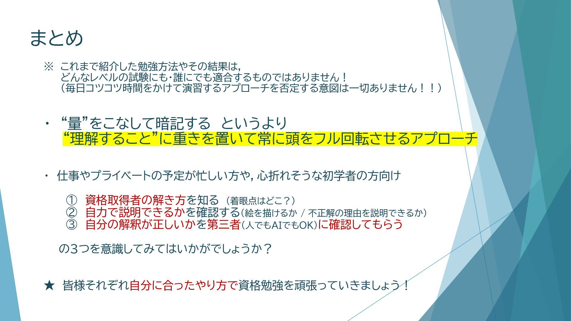 仕事やプライベートの予定が忙しい方や,心折れそうな初学者の方向け ① 資格取得者の解き方を知る (着眼点はどこ?) ② 自力で説明できるかを確認する(絵を描けるか / 不正解の理由を説明できるか) ③ 自分の解釈が正しいかを第三者(人でもAIでもOK)に確認してもらう の3つを意識してみてはいかがでしょうか? ★ 皆様それぞれ自分に合ったやり方で資格勉強を頑張っていきましょう!