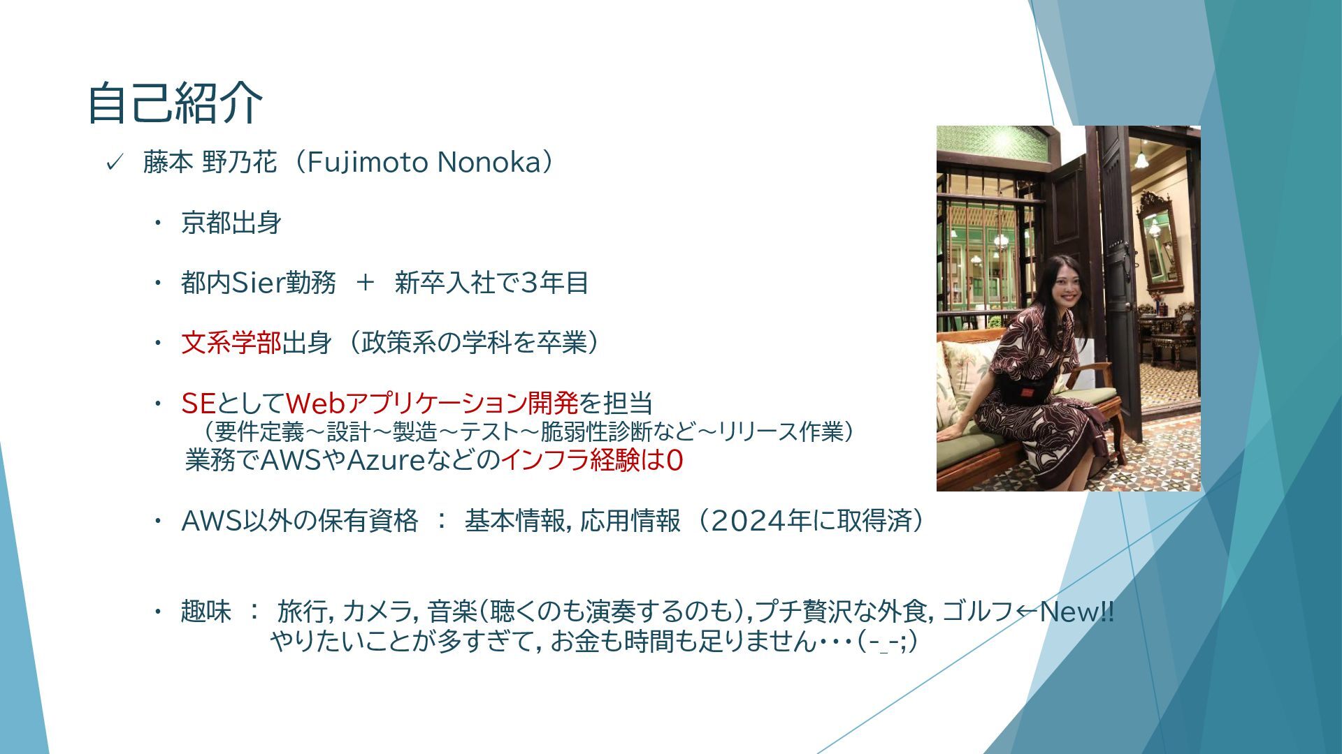 + 新卒入社で3年目 ・ 文系学部出身 (政策系の学科を卒業) ・ SEとしてWebアプリケーション開発を担当 (要件定義~設計~製造~テスト~脆弱性診断など~リリース作業) 業務でAWSやAzureなどのインフラ経験は0 ・ AWS以外の保有資格 : 基本情報,応用情報 (2024年に取得済) ・ 趣味 : 旅行,カメラ,音楽(聴くのも演奏するのも),プチ贅沢な外食,ゴルフ←New!! やりたいことが多すぎて,お金も時間も足りません・・・(-_-;)