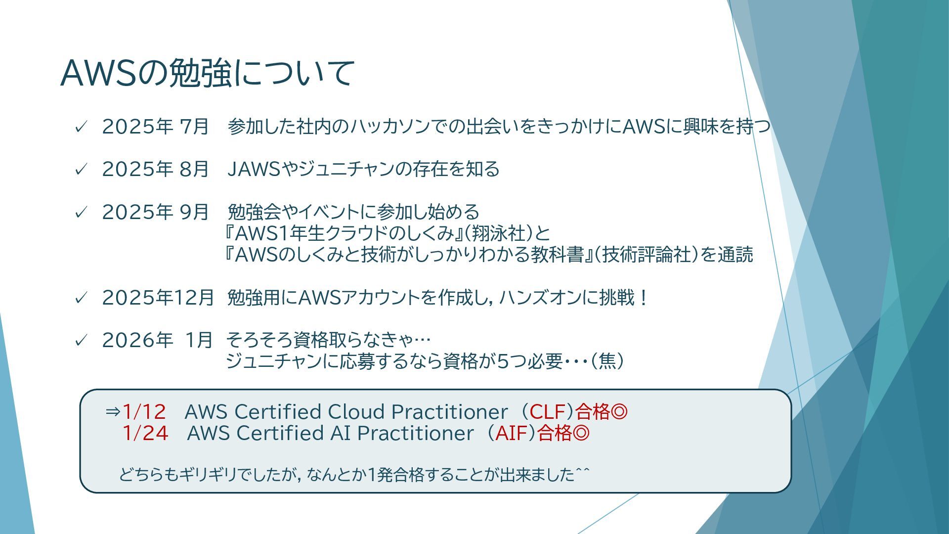 AWSの勉強について ✓ 2025年 7月 参加した社内のハッカソンでの出会いをきっかけにAWSに興味を持つ ✓ 2025年 8月 JAWSやジュニチャンの存在を知る ✓