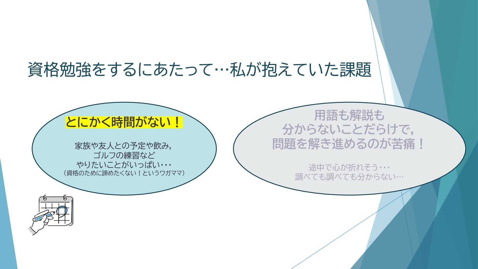 資格勉強をするにあたって…私が抱えていた課題 とにかく時間がない! 家族や友人との予定や飲み, ゴルフの練習など やりたいことがいっぱい・・・ (資格のために諦めたくない!というワガママ) 用語も解説も 分からないことだらけで, 問題を解き進めるのが苦痛! 途中で心が折れそう・・・