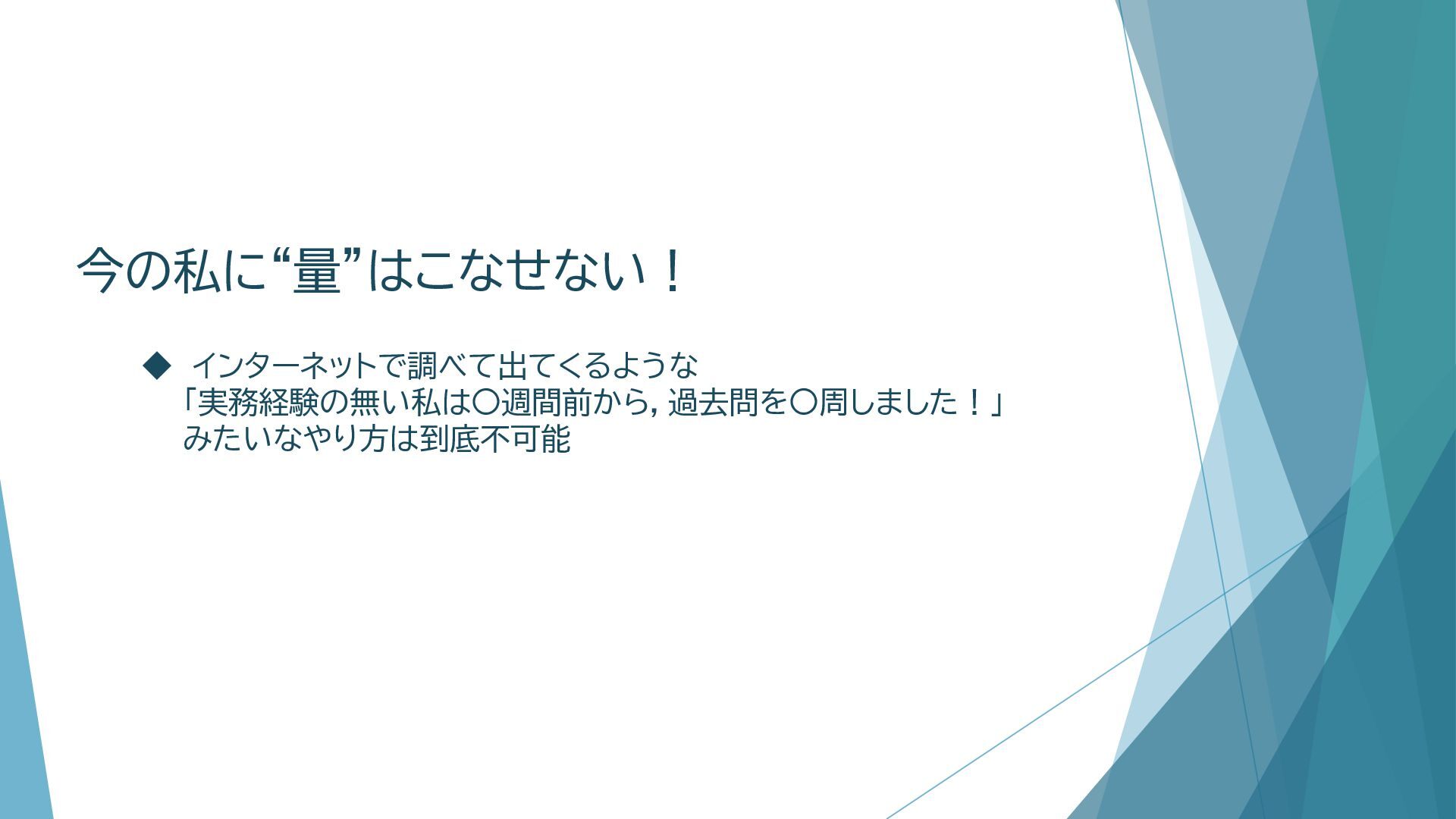 今の私に“量”はこなせない! ◆ インターネットで調べて出てくるような 「実務経験の無い私は〇週間前から,過去問を〇周しました!」 みたいなやり方は到底不可能