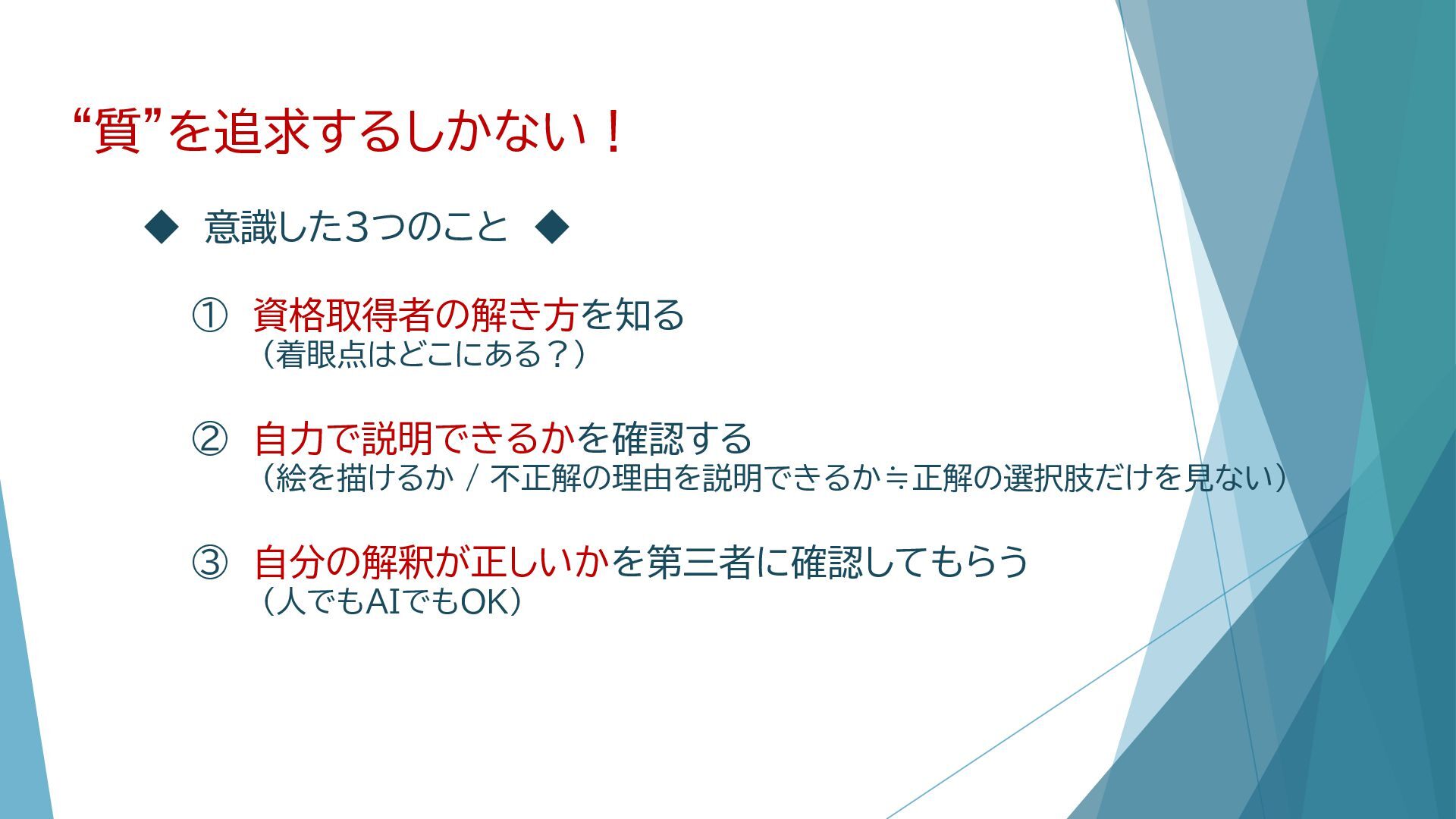 “質”を追求するしかない! ◆ 意識した3つのこと ◆ ① 資格取得者の解き方を知る (着眼点はどこにある?) ② 自力で説明できるかを確認する (絵を描けるか