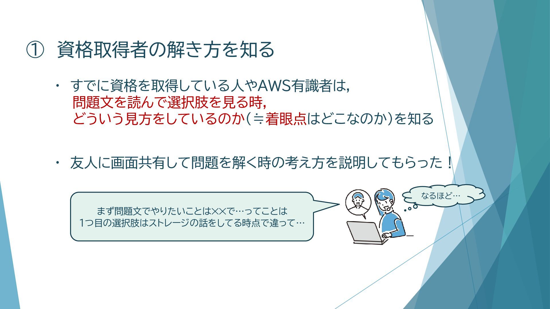 ① 資格取得者の解き方を知る ・ すでに資格を取得している人やAWS有識者は, 問題文を読んで選択肢を見る時, どういう見方をしているのか(≒着眼点はどこなのか)を知る ・ 友人に画面共有して問題を解く時の考え方を説明してもらった! まず問題文でやりたいことは✕✕で…ってことは 1つ目の選択肢はストレージの話をしてる時点で違って…