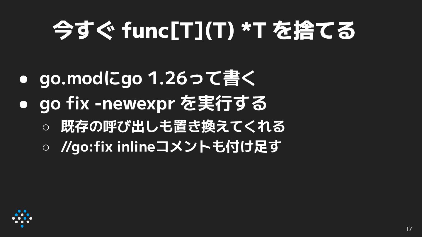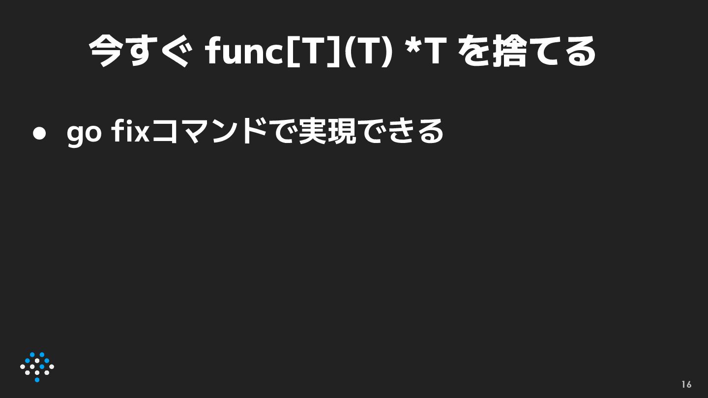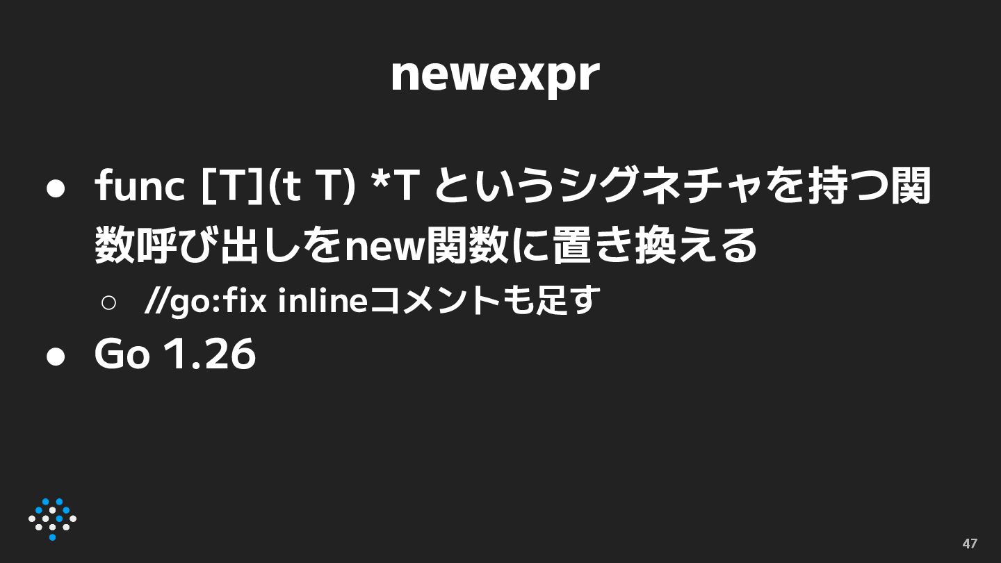 newexpr • func [T](t T) *T というシグネチャを持つ関 数呼び出しをnew関数に置き換える ◦ //go:fix