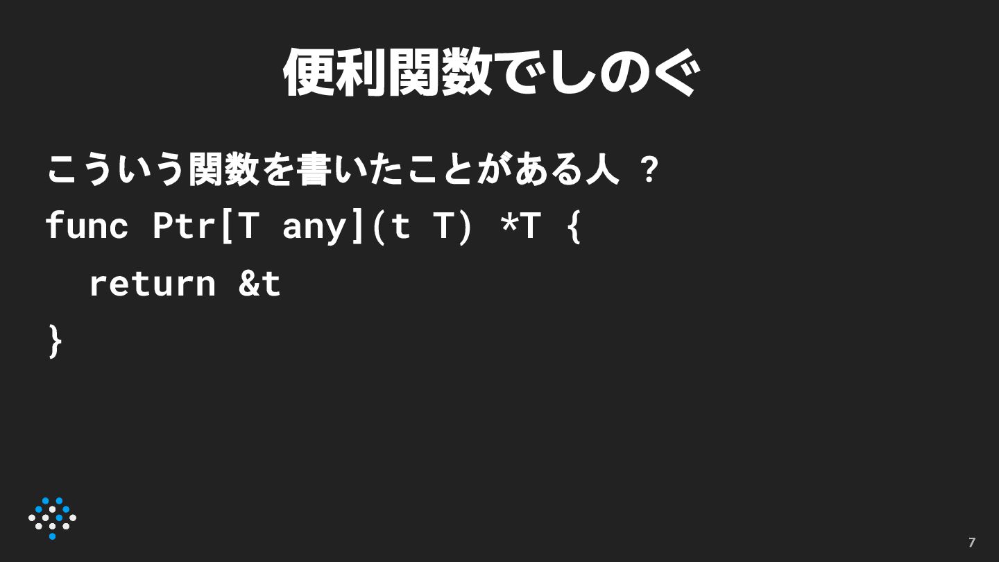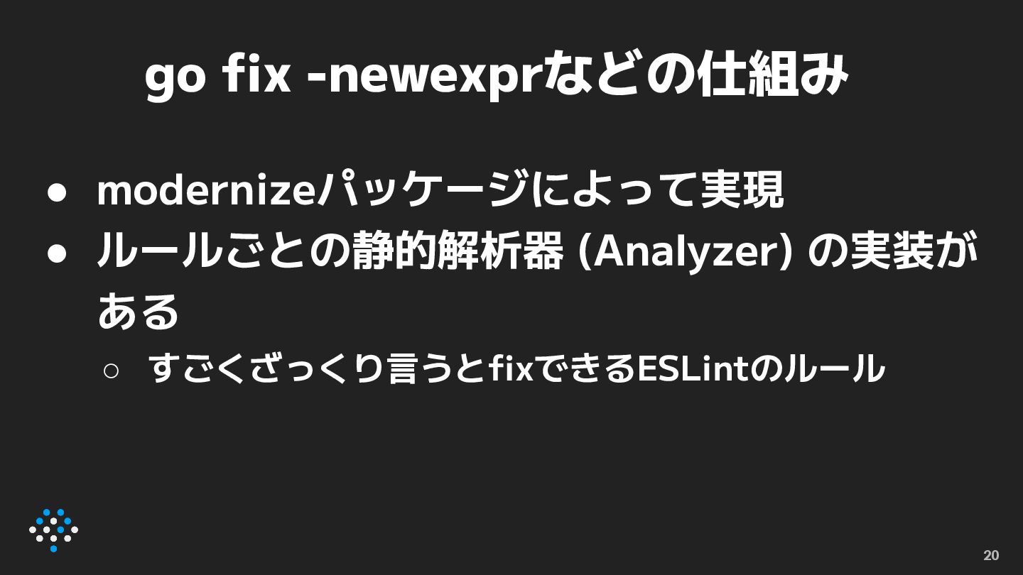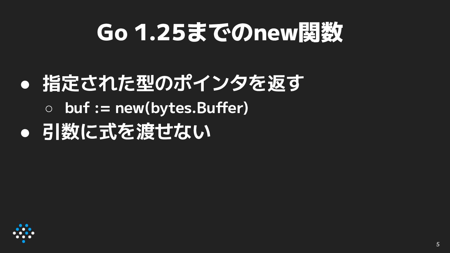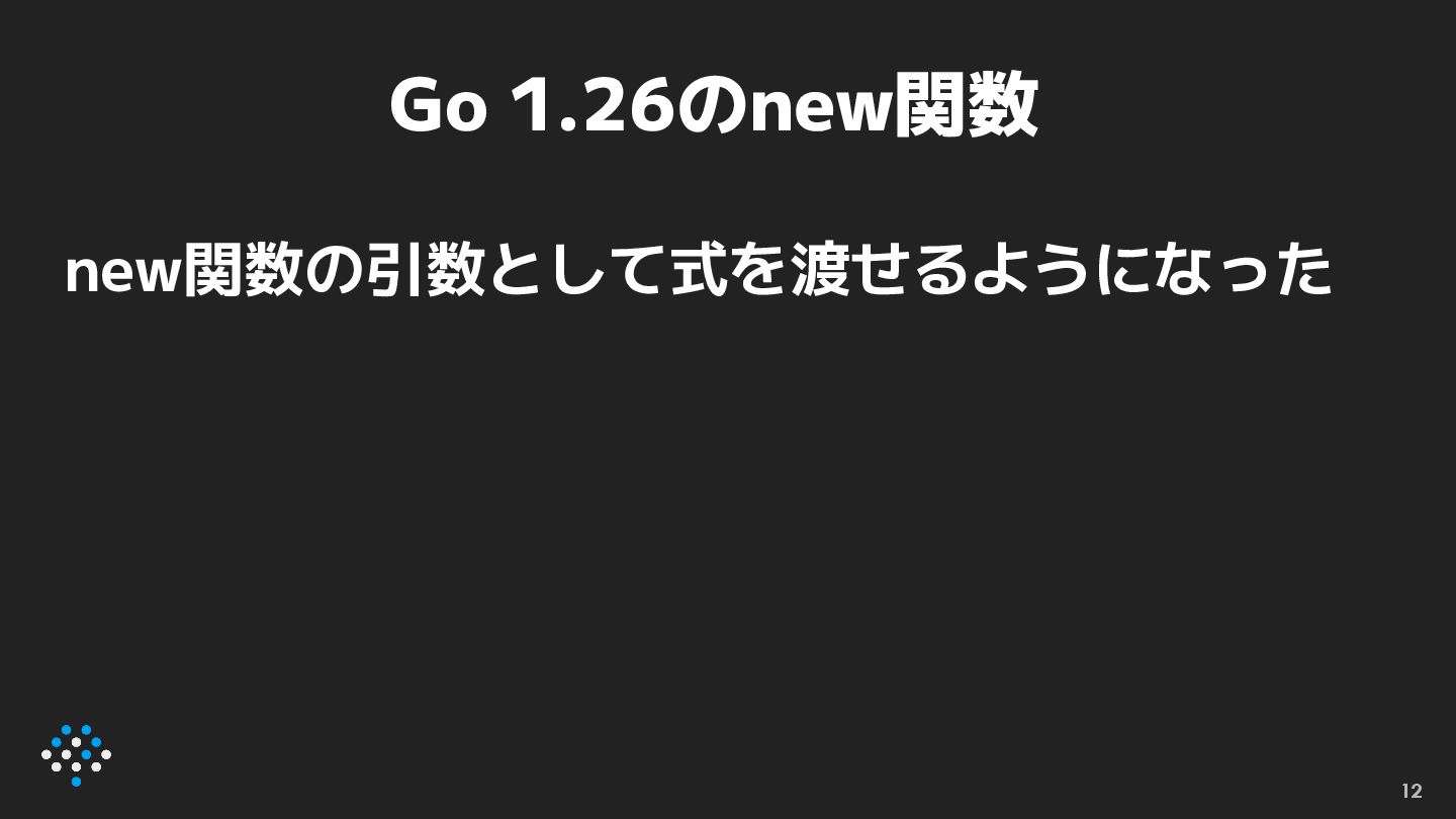 newexpr • func [T](t T) *T というシグネチャを持つ関 数呼び出しをnew関数に置き換える ◦ //go:fix