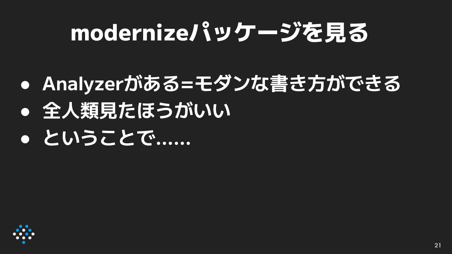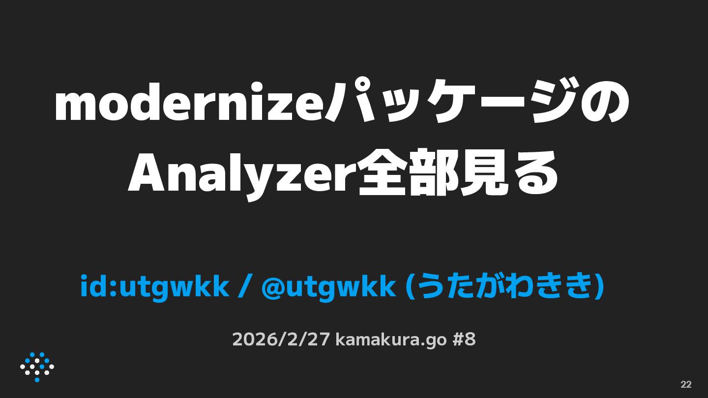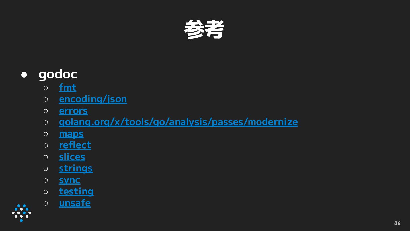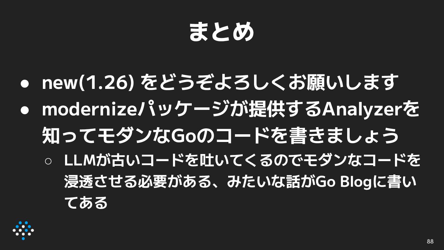 まとめ • new(1.26) をどうぞよろしくお願いします • modernizeパッケージが提供するAnalyzerを 知ってモダンなGoのコードを書きましょう ◦ LLMが古いコードを吐いてくるのでモダンなコードを 浸透させる必要がある、みたいな話がGo