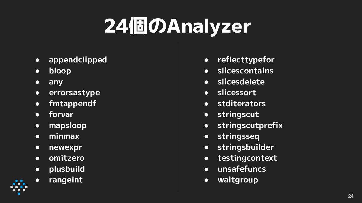 fmtappendf • forvar • mapsloop • minmax • newexpr • omitzero • plusbuild • rangeint 24 • reflecttypefor • slicescontains • slicesdelete • slicessort • stditerators • stringscut • stringscutprefix • stringsseq • stringsbuilder • testingcontext • unsafefuncs • waitgroup