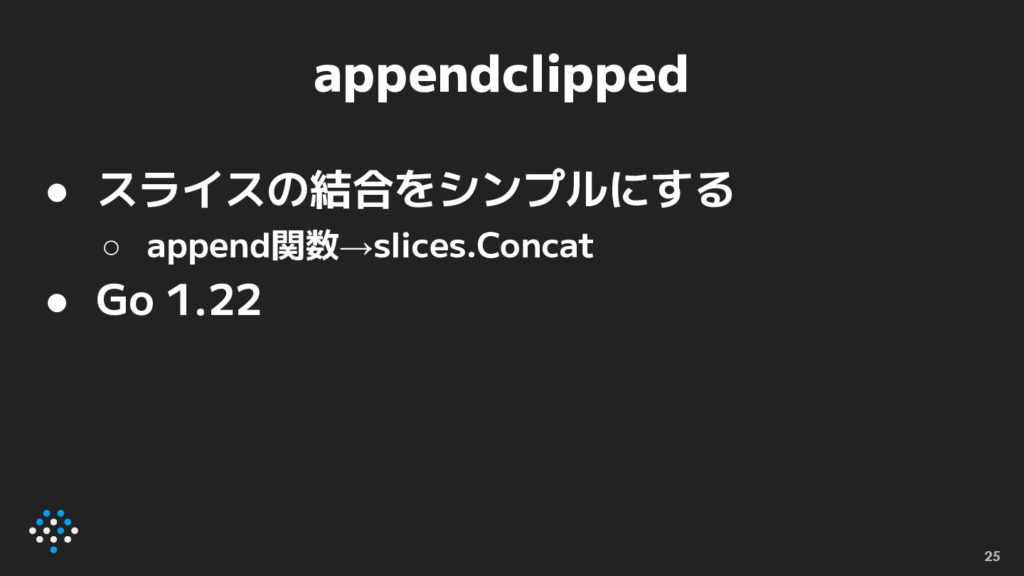 appendclipped • スライスの結合をシンプルにする ◦ append関数→slices.Concat • Go 1.22 25