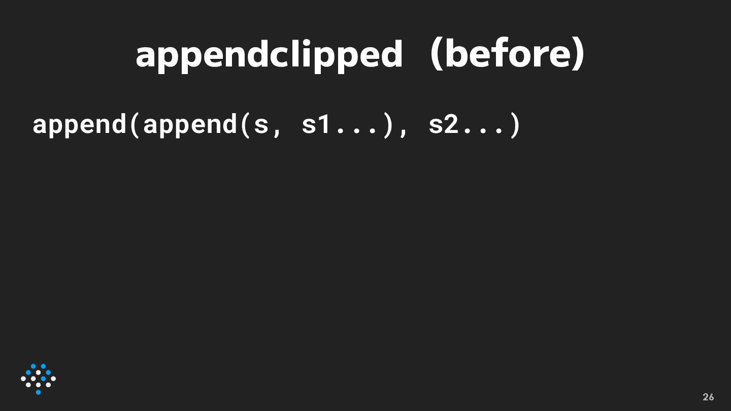appendclipped (before) append(append(s, s1...), s2...) 26