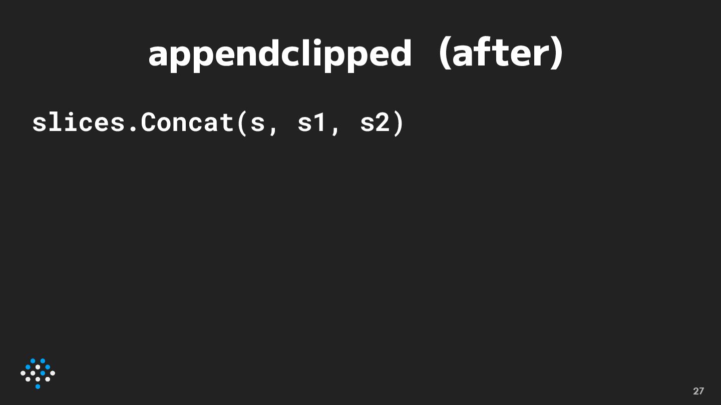 appendclipped (after) slices.Concat(s, s1, s2) 27
