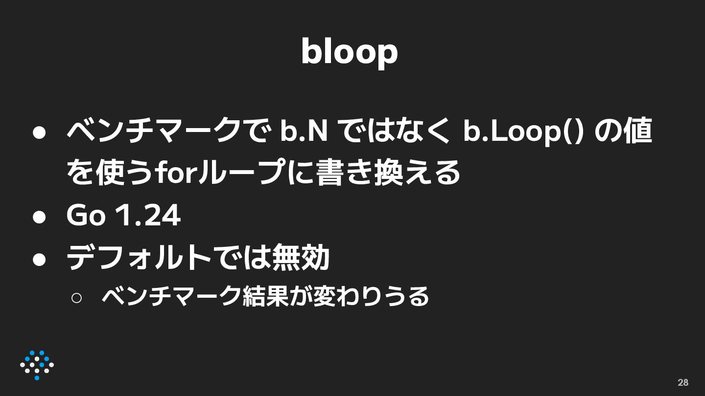 bloop • ベンチマークで b.N ではなく b.Loop() の値 を使うforループに書き換える • Go