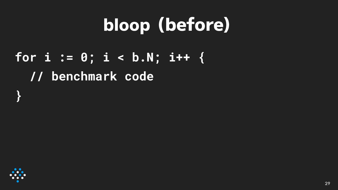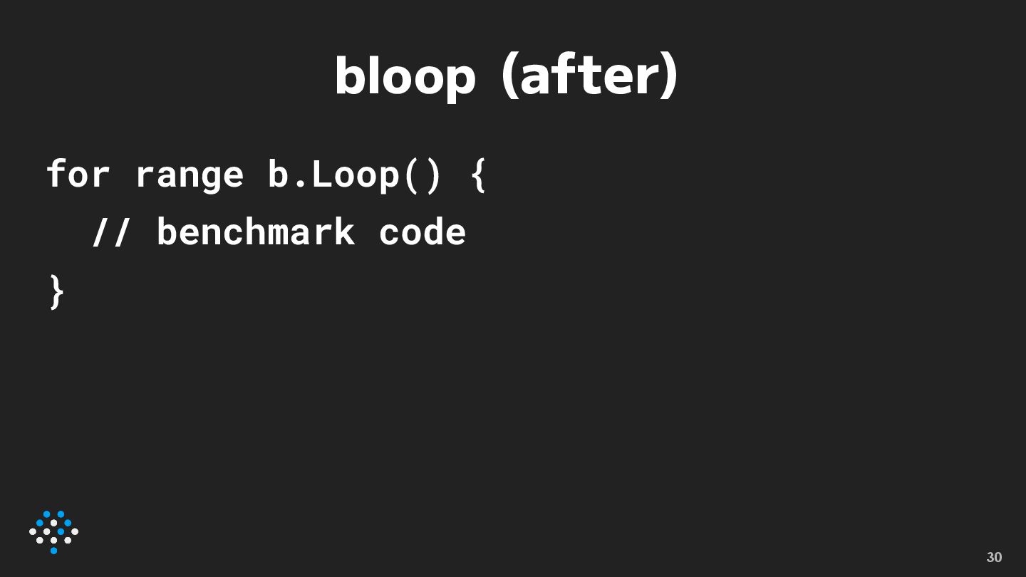 bloop (after) for range b.Loop() { // benchmark code }