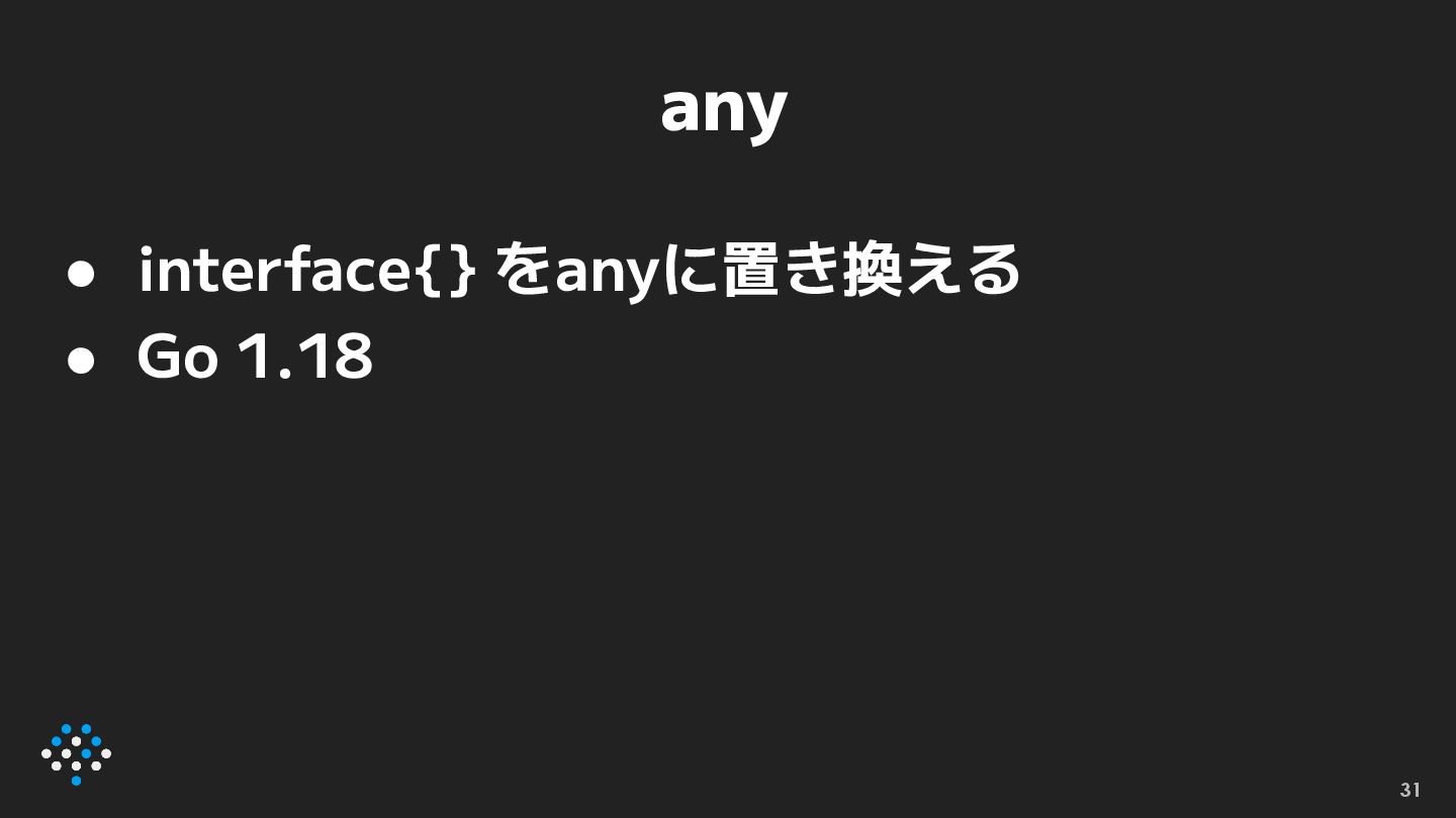 any • interface{} をanyに置き換える • Go 1.18 31