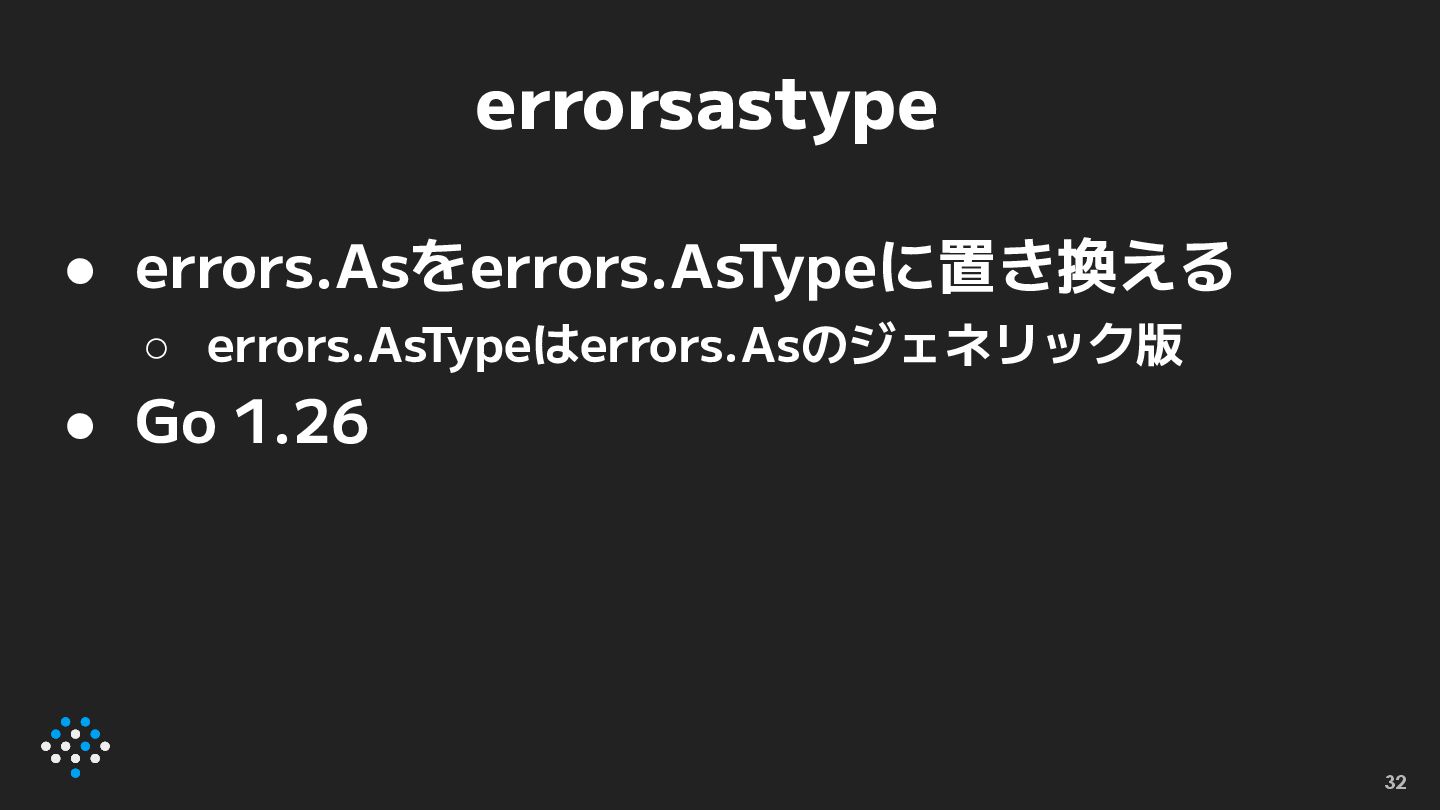 errorsastype • errors.Asをerrors.AsTypeに置き換える ◦ errors.AsTypeはerrors.Asのジェネリック版 • Go 1.26 32