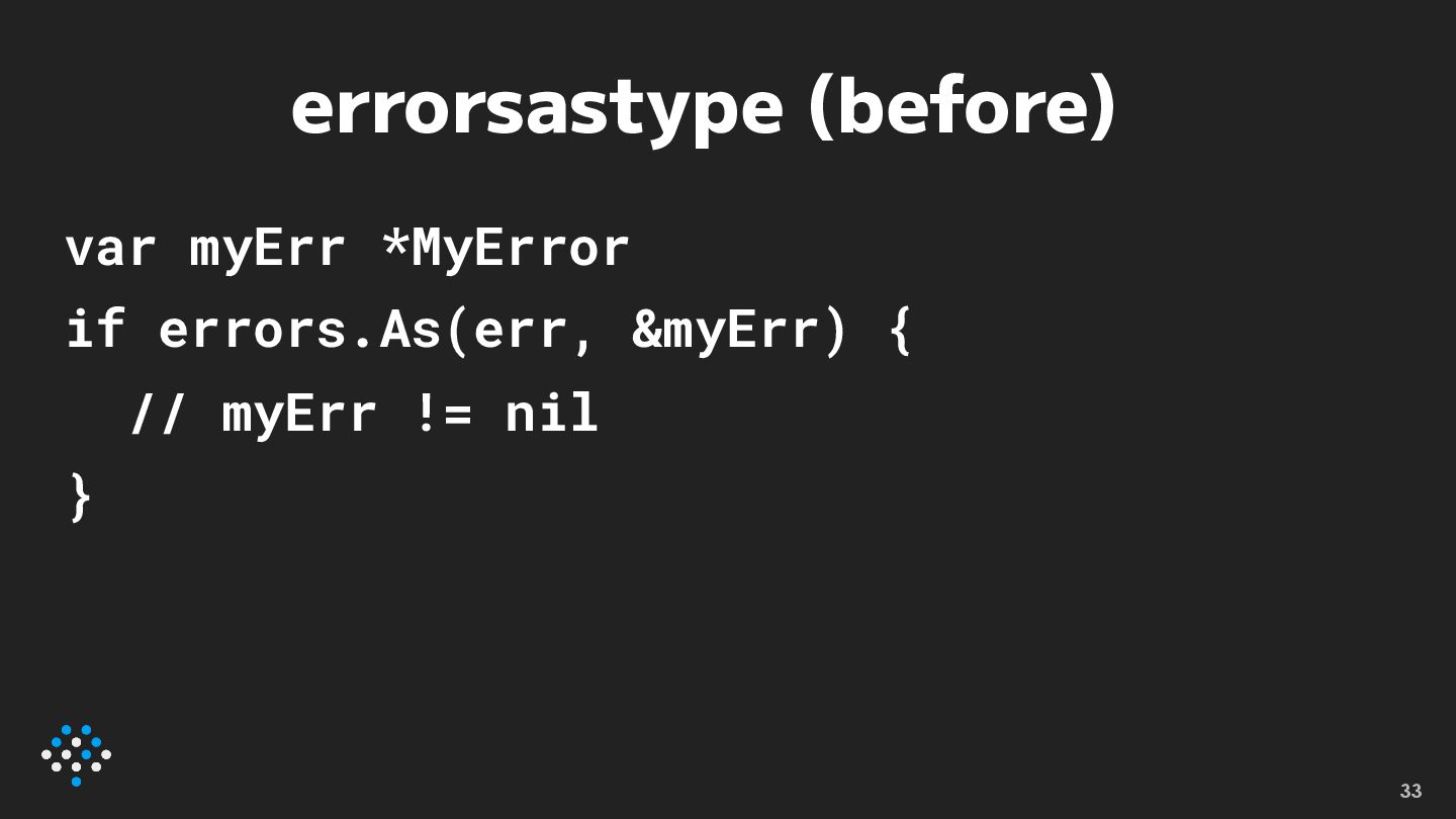errorsastype (before) var myErr *MyError if errors.As(err, &myErr) { //