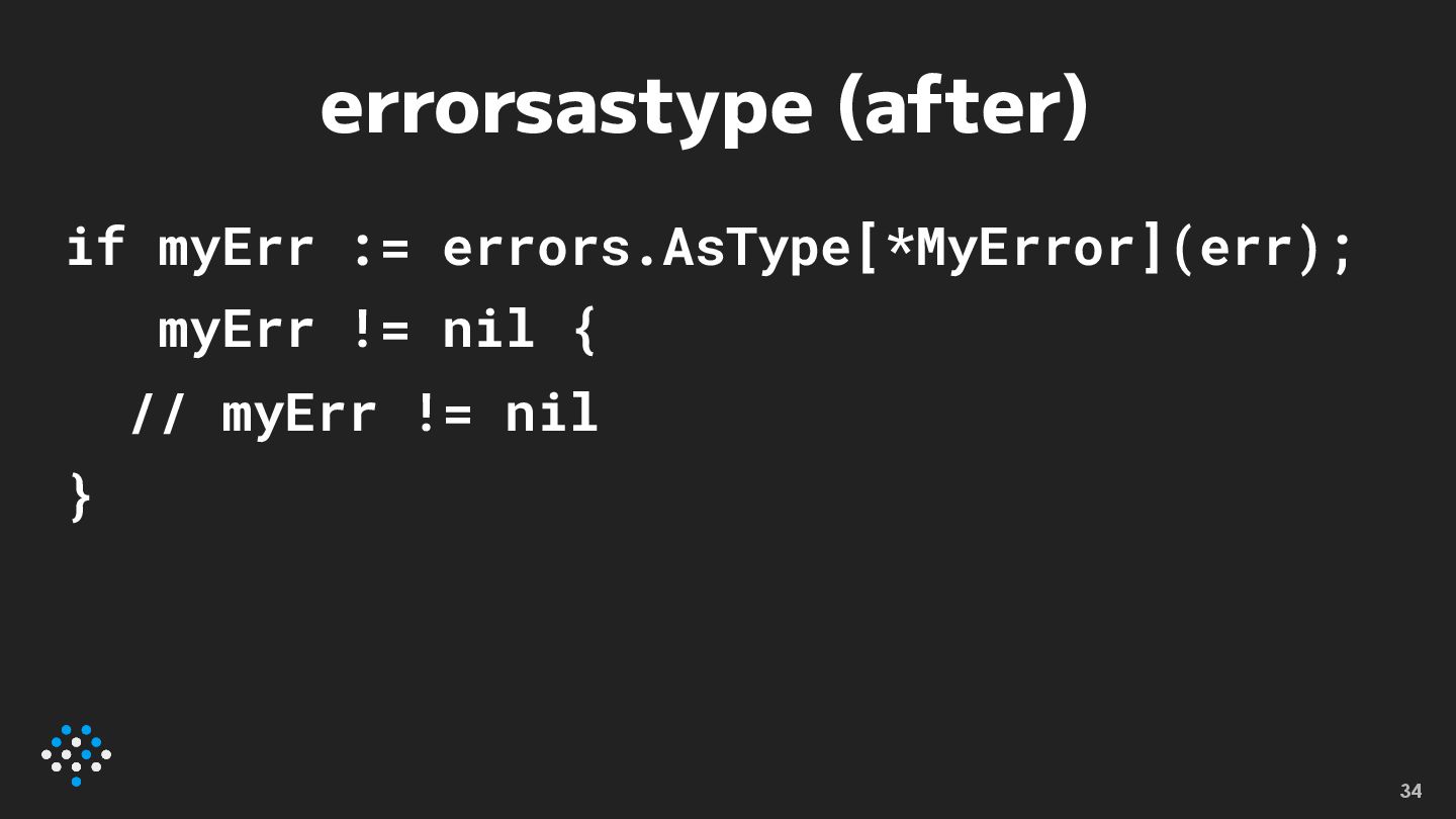 errorsastype (after) if myErr := errors.AsType[*MyError](err); myErr != nil {