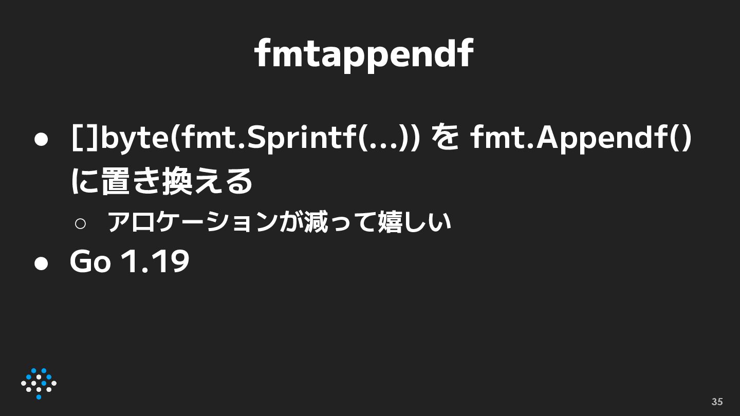 fmtappendf • []byte(fmt.Sprintf(...)) を fmt.Appendf() に置き換える ◦ アロケーションが減って嬉しい • Go