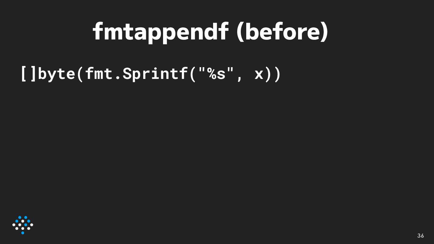 fmtappendf (before) []byte(fmt.Sprintf("%s", x)) 36