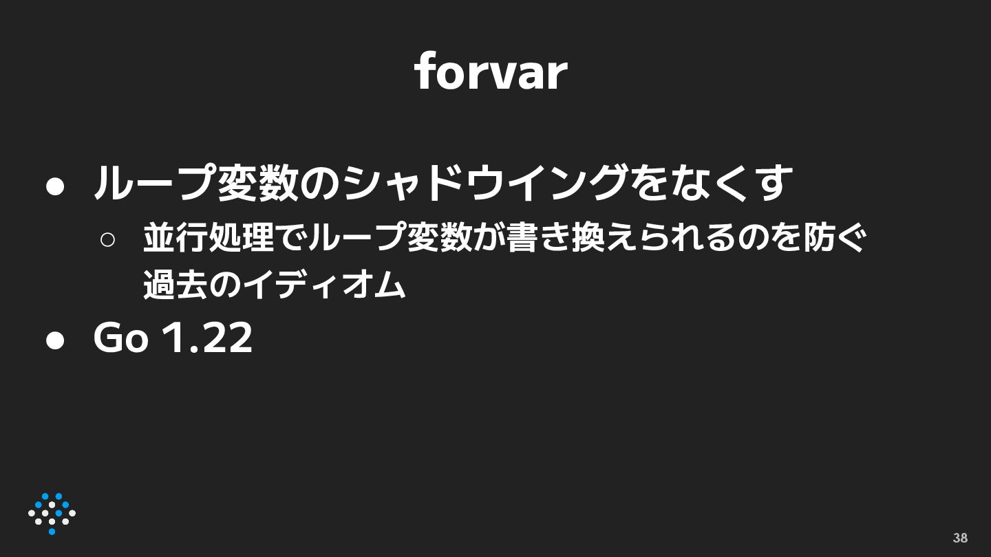 forvar • ループ変数のシャドウイングをなくす ◦ 並行処理でループ変数が書き換えられるのを防ぐ 過去のイディオム • Go 1.22 38