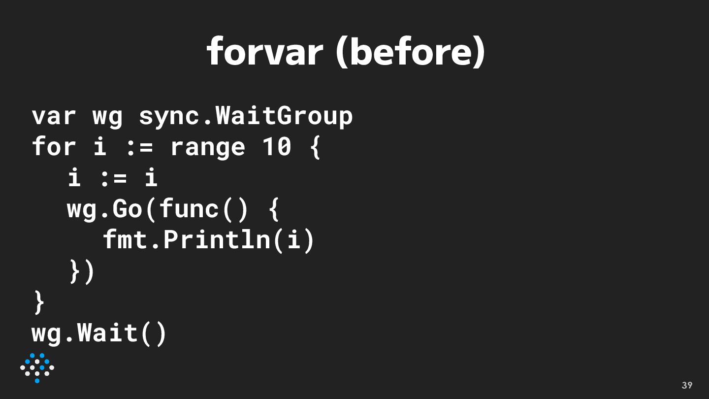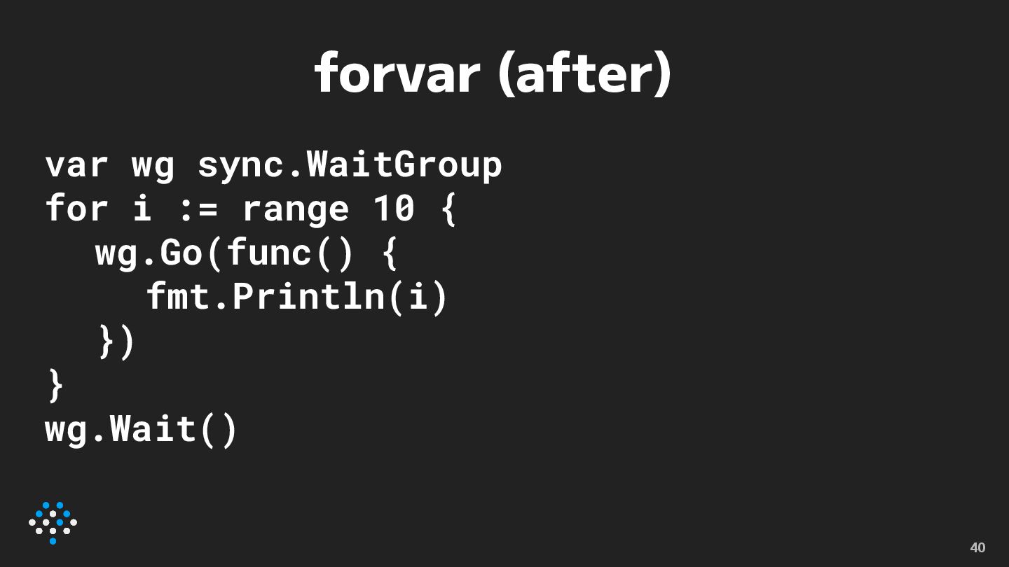 forvar (after) var wg sync.WaitGroup for i := range 10