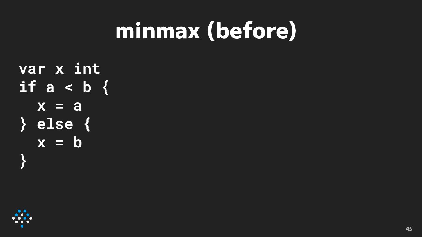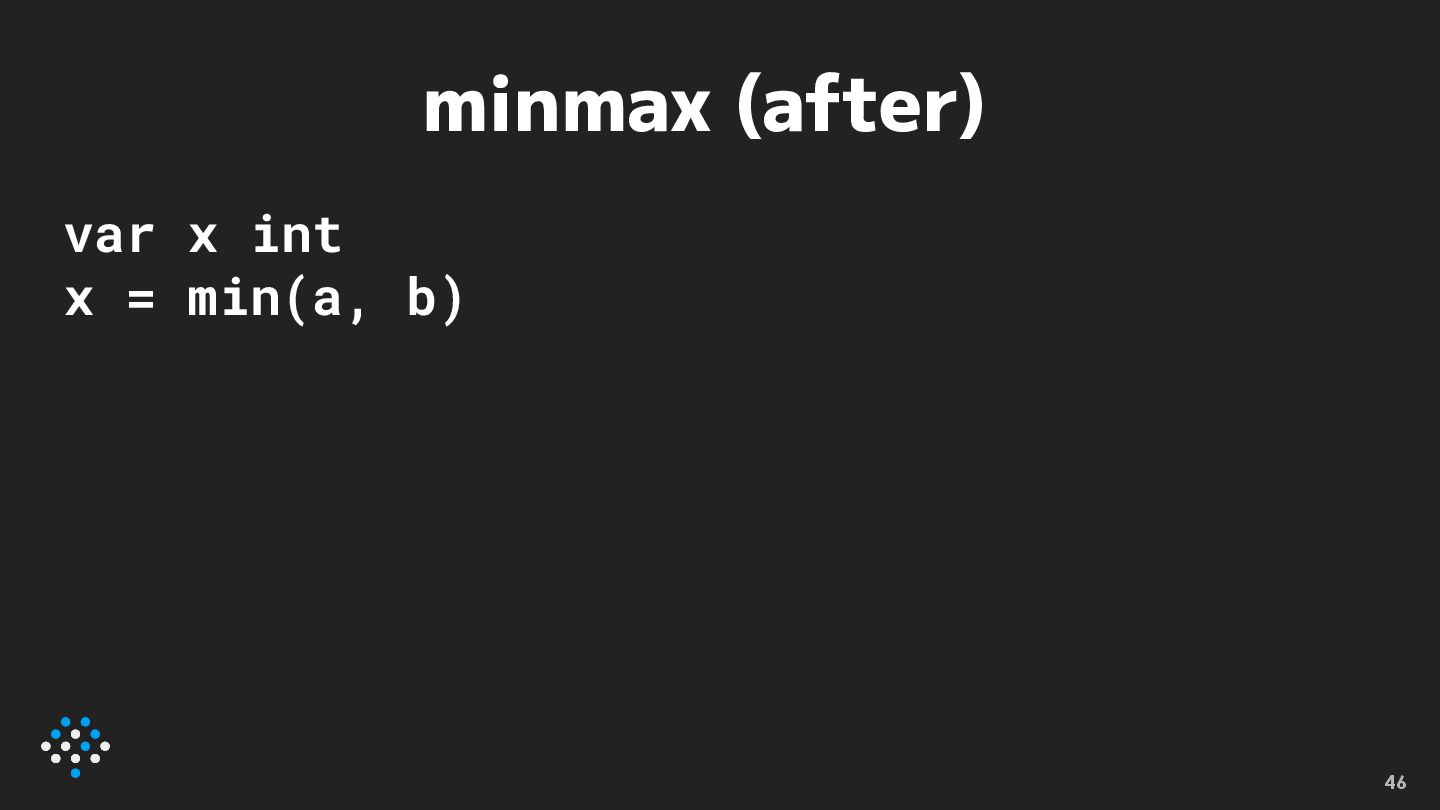 minmax (after) var x int x = min(a, b) 46