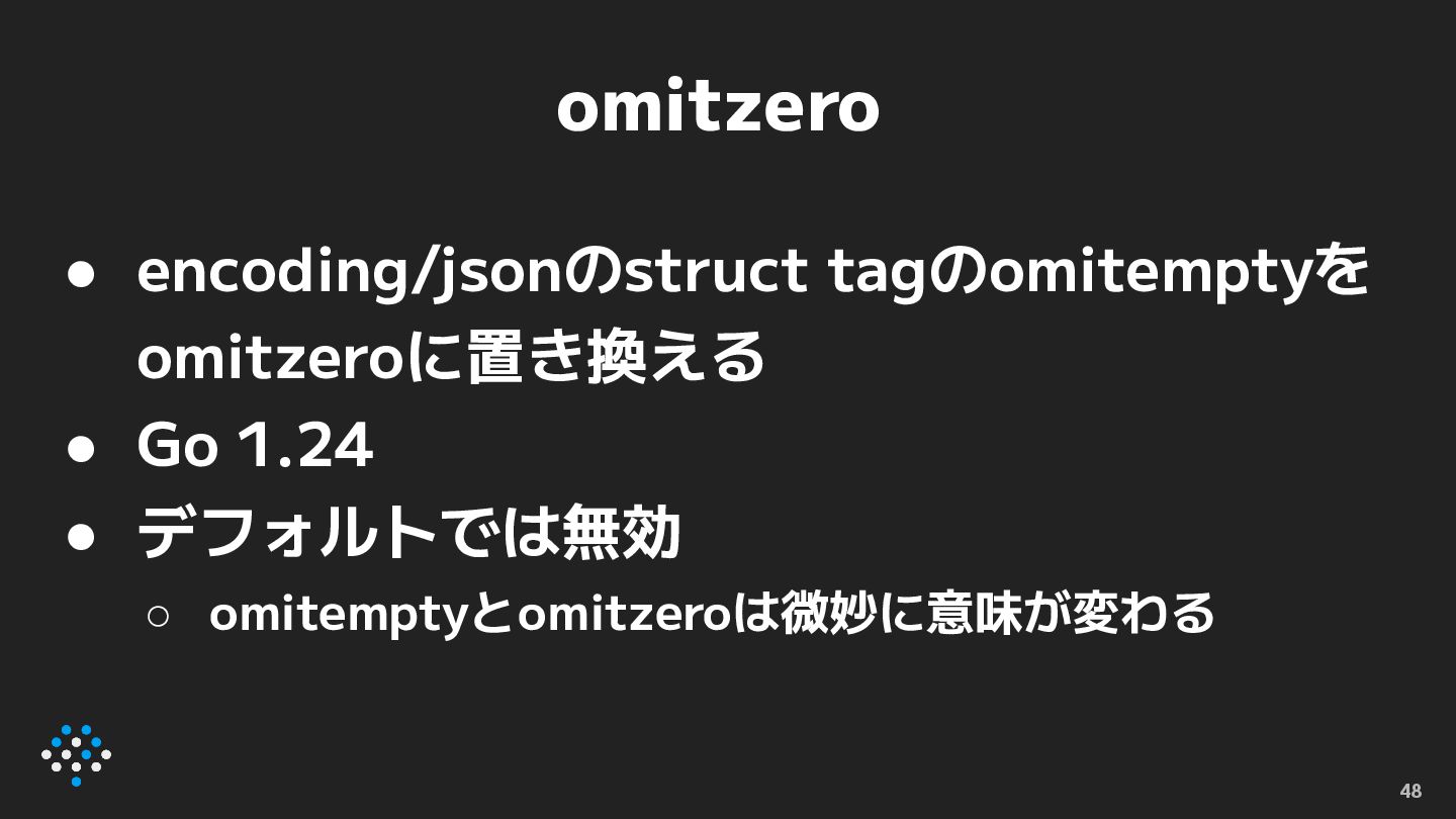 omitzero • encoding/jsonのstruct tagのomitemptyを omitzeroに置き換える • Go 1.24 • デフォルトでは無効