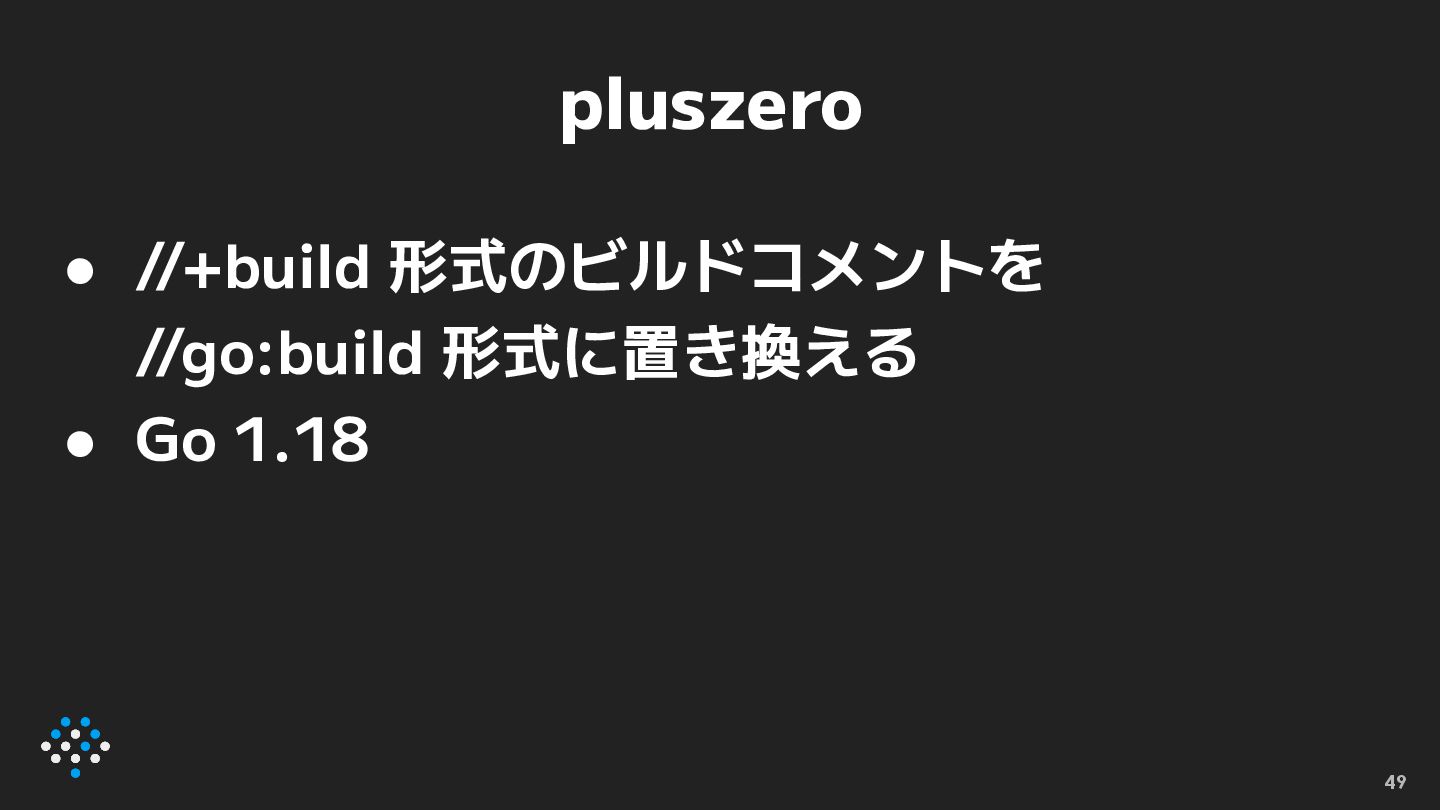 pluszero • //+build 形式のビルドコメントを //go:build 形式に置き換える • Go 1.18 49