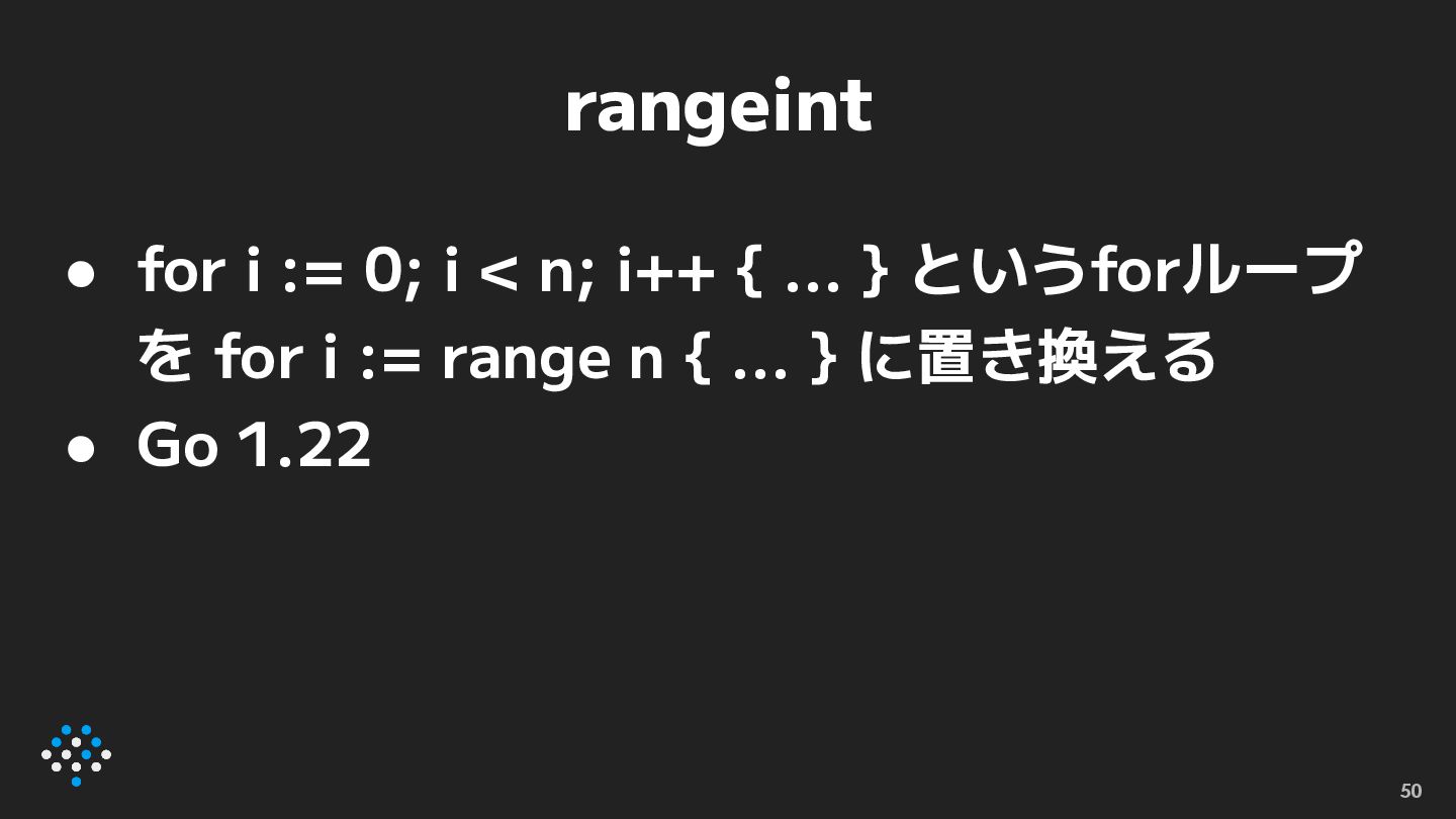 { ... } というforループ を for i := range n { ... } に置き換える • Go 1.22 50