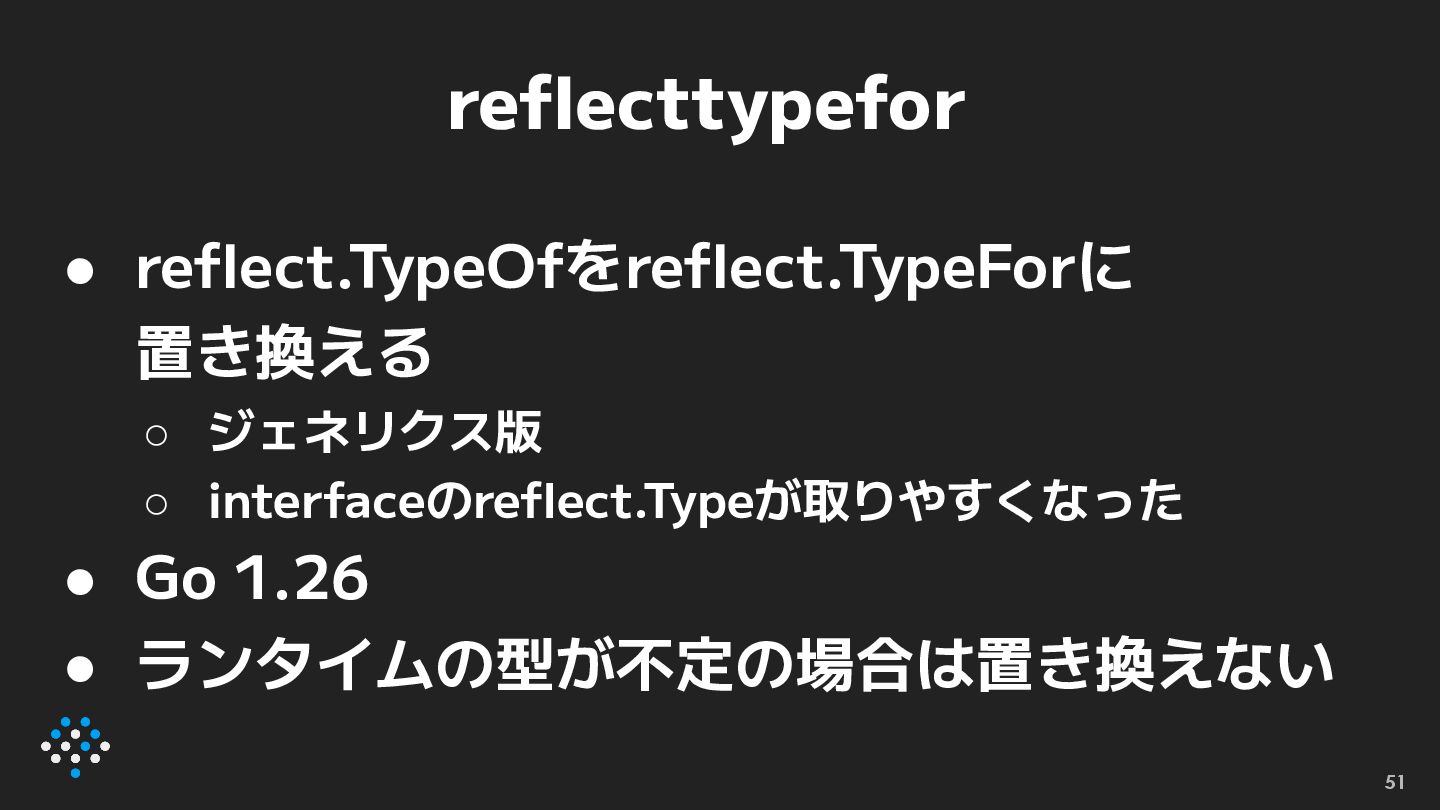 reflecttypefor • reflect.TypeOfをreflect.TypeForに 置き換える ◦ ジェネリクス版 ◦ interfaceのreflect.Typeが取りやすくなった • Go