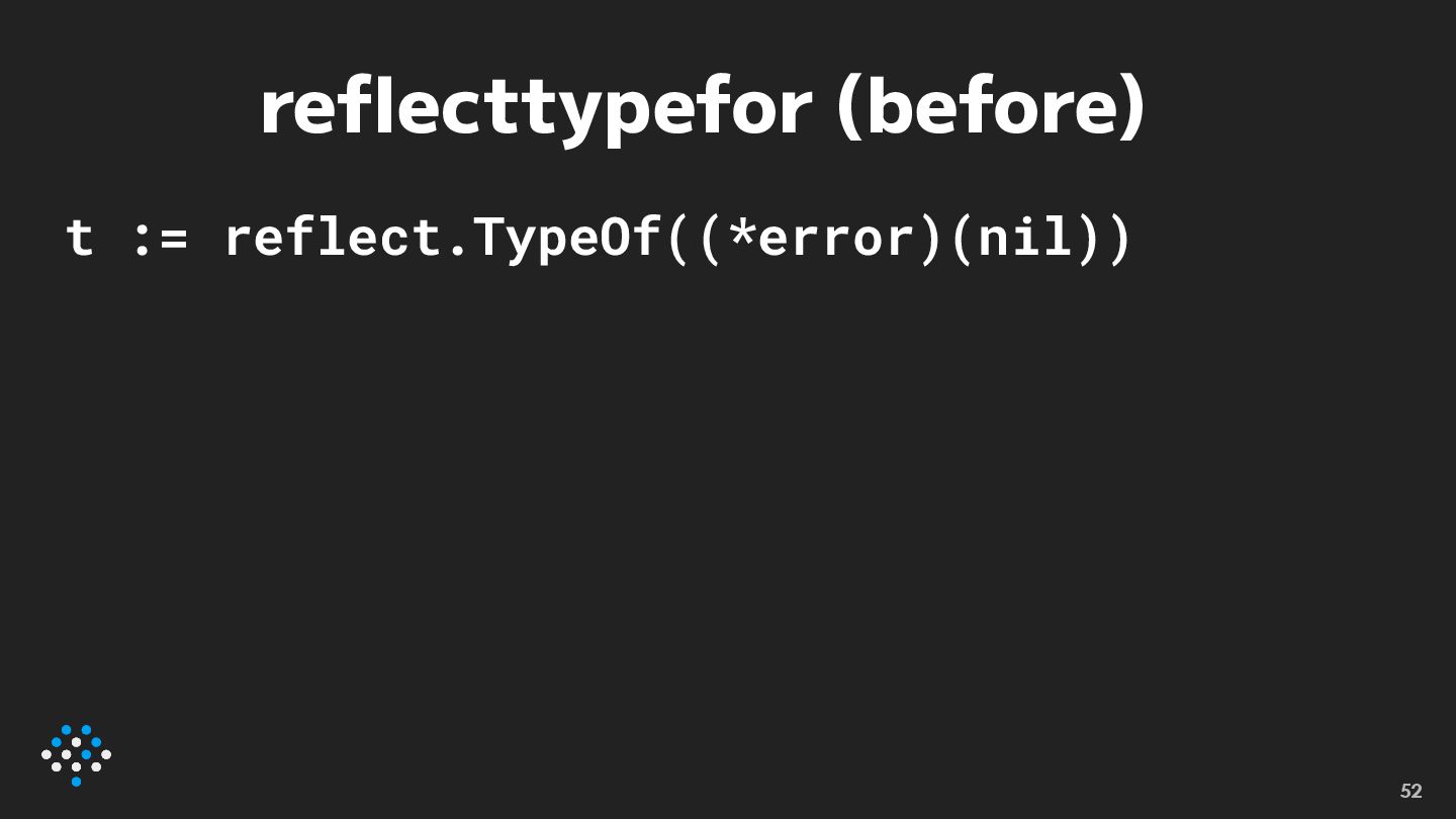reflecttypefor (before) t := reflect.TypeOf((*error)(nil)) 52