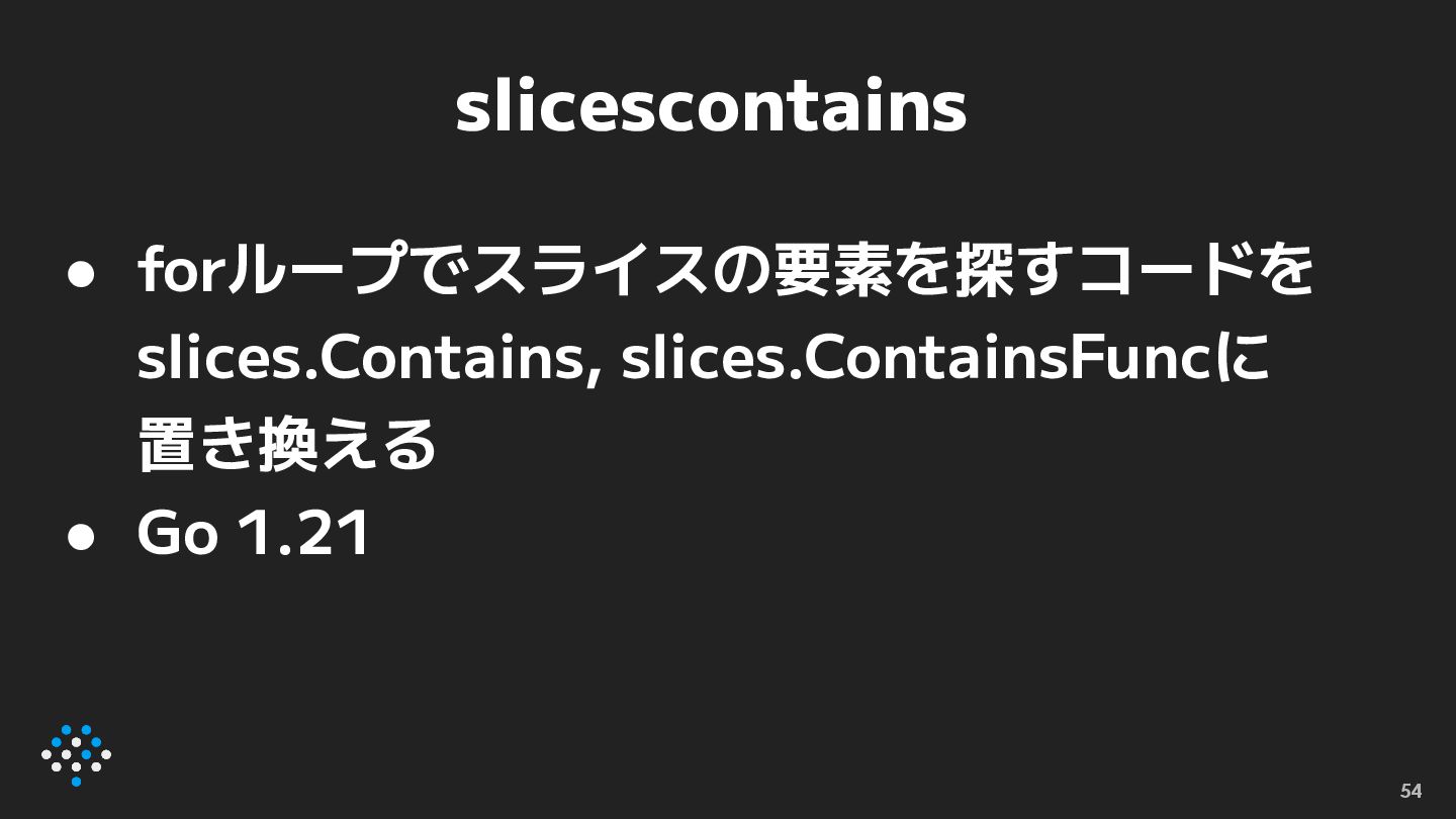 slicescontains • forループでスライスの要素を探すコードを slices.Contains, slices.ContainsFuncに 置き換える • Go 1.21 54