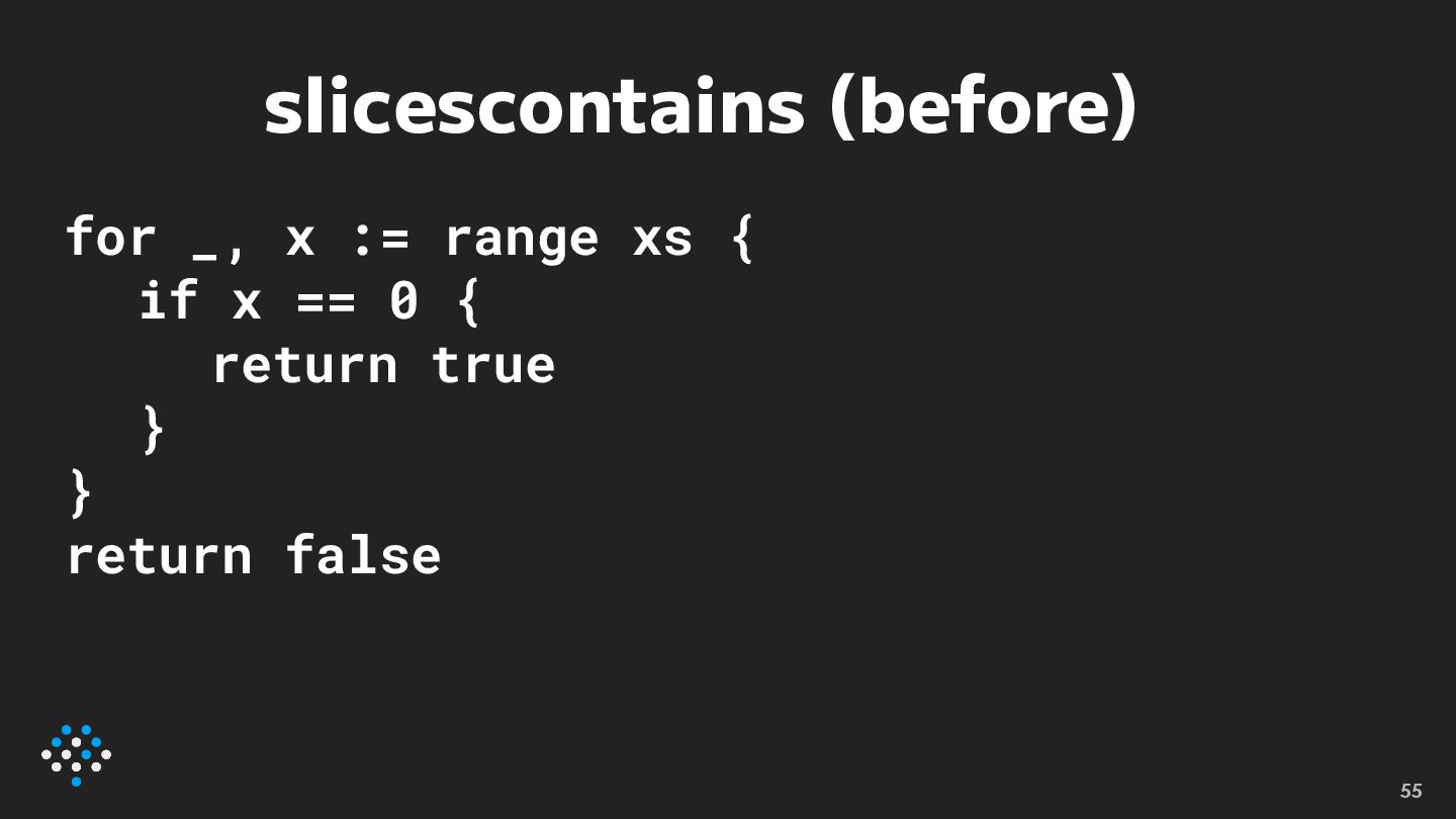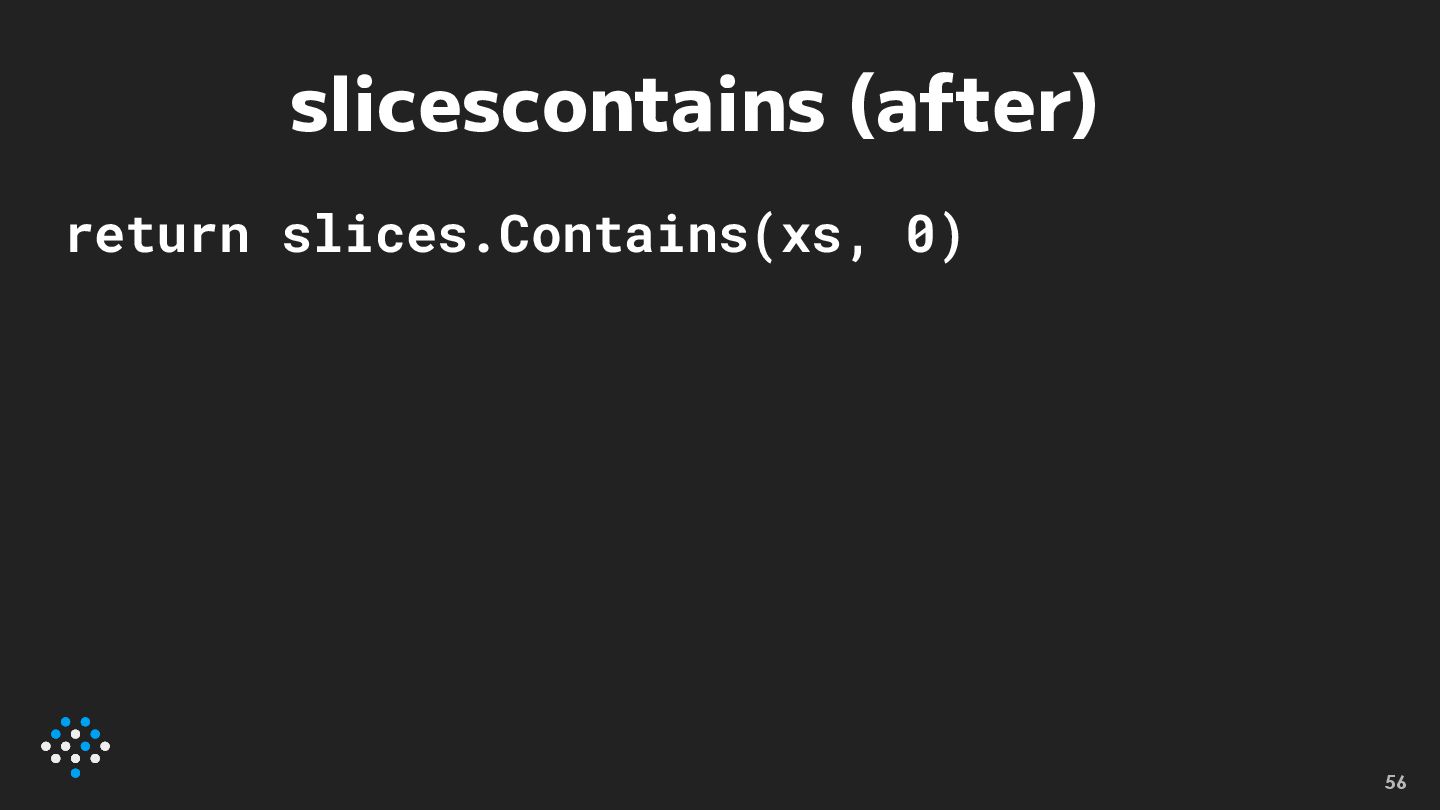 slicescontains (after) return slices.Contains(xs, 0) 56