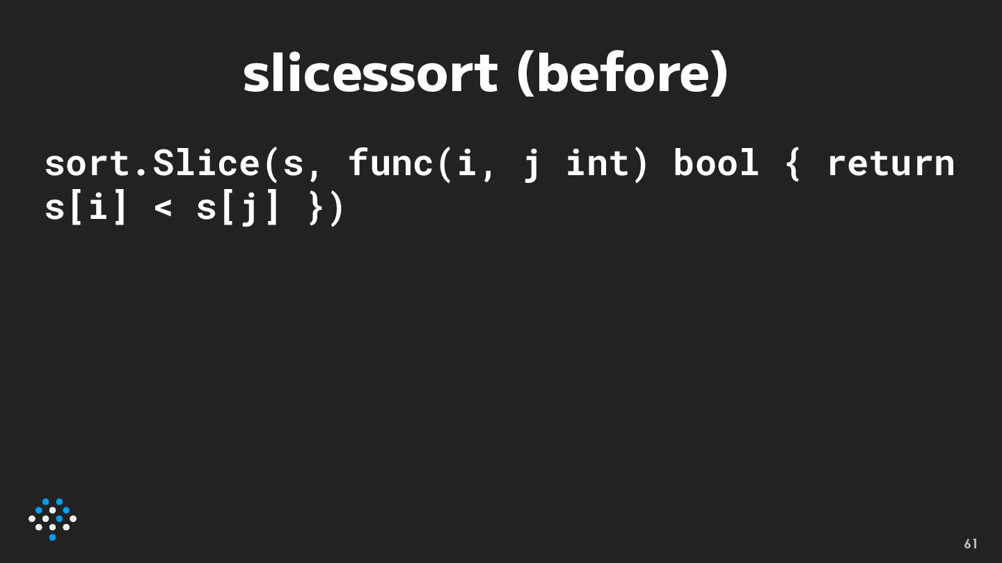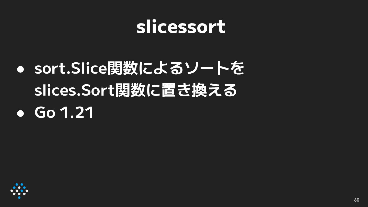slicessort • sort.Slice関数によるソートを slices.Sort関数に置き換える • Go 1.21 60