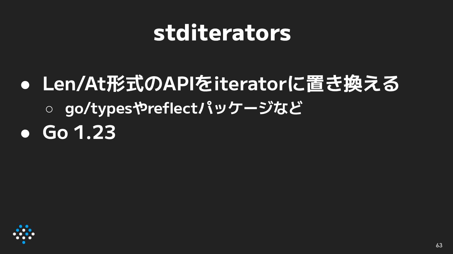 stditerators • Len/At形式のAPIをiteratorに置き換える ◦ go/typesやreflectパッケージなど • Go 1.23 63