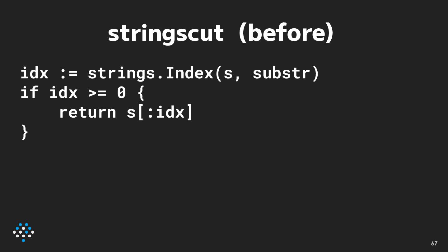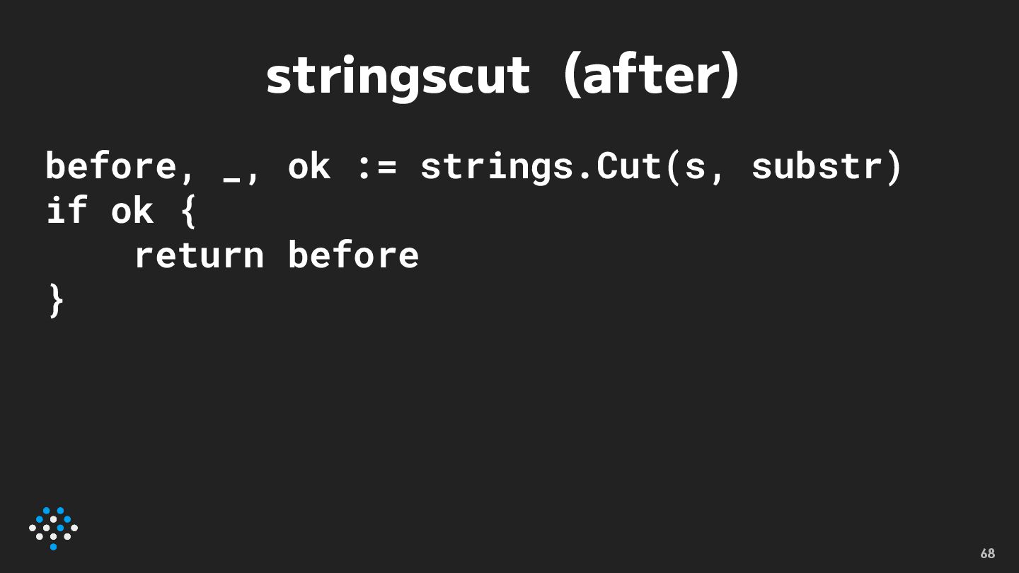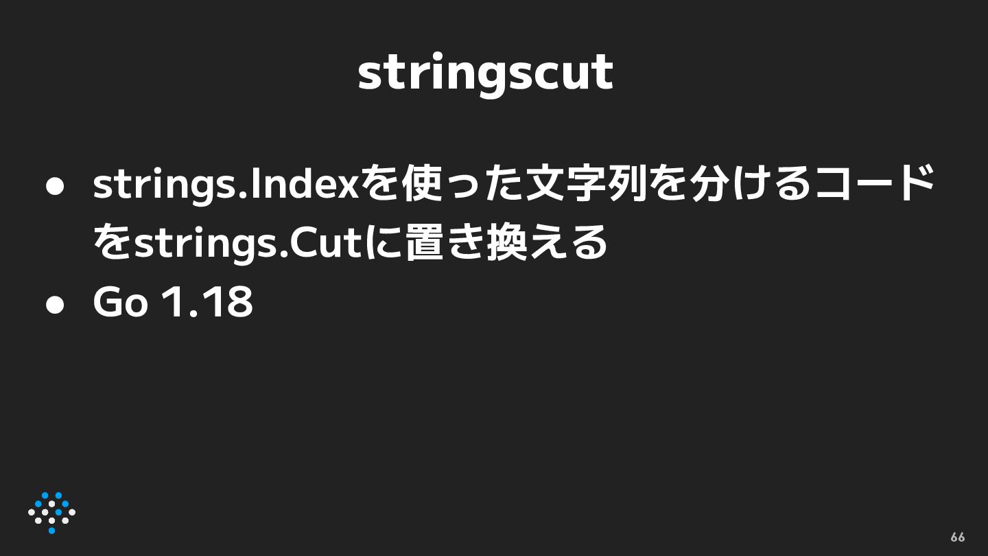 stringscut • strings.Indexを使った文字列を分けるコード をstrings.Cutに置き換える • Go 1.18 66