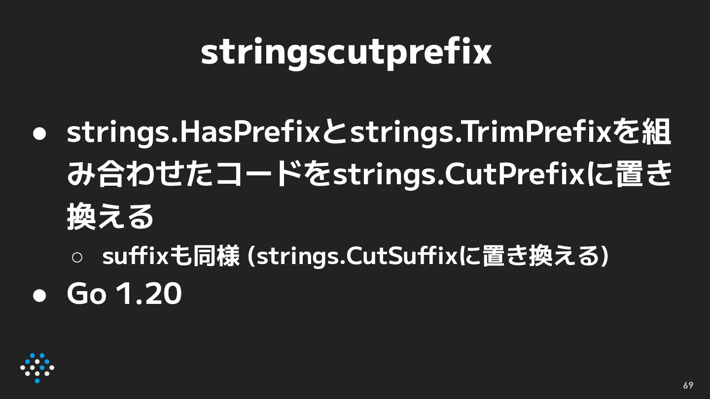 stringscutprefix • strings.HasPrefixとstrings.TrimPrefixを組 み合わせたコードをstrings.CutPrefixに置き 換える ◦ suffixも同様 (strings.CutSuffixに置き換える) • Go