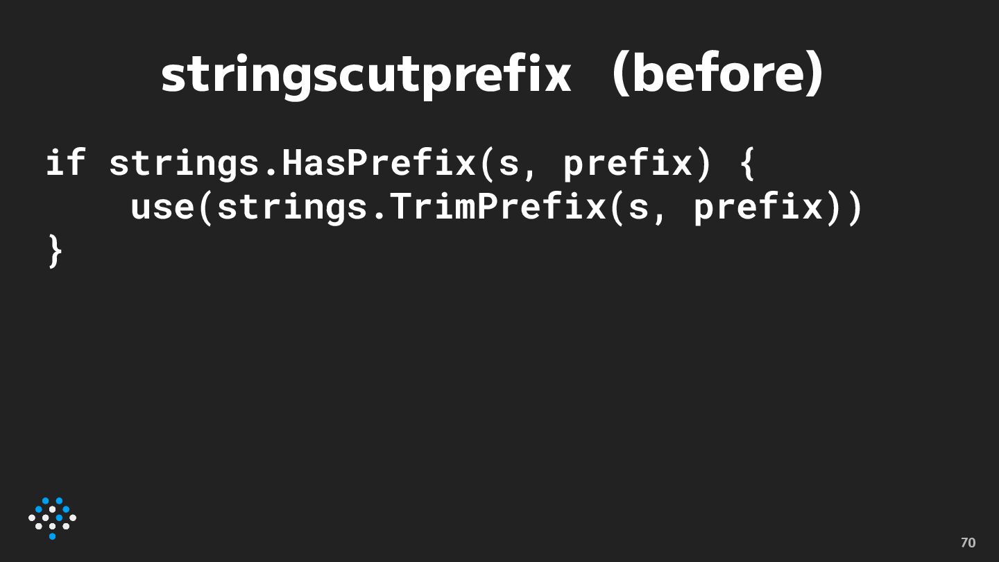 stringscutprefix (before) if strings.HasPrefix(s, prefix) { use(strings.TrimPrefix(s, prefix)) } 70