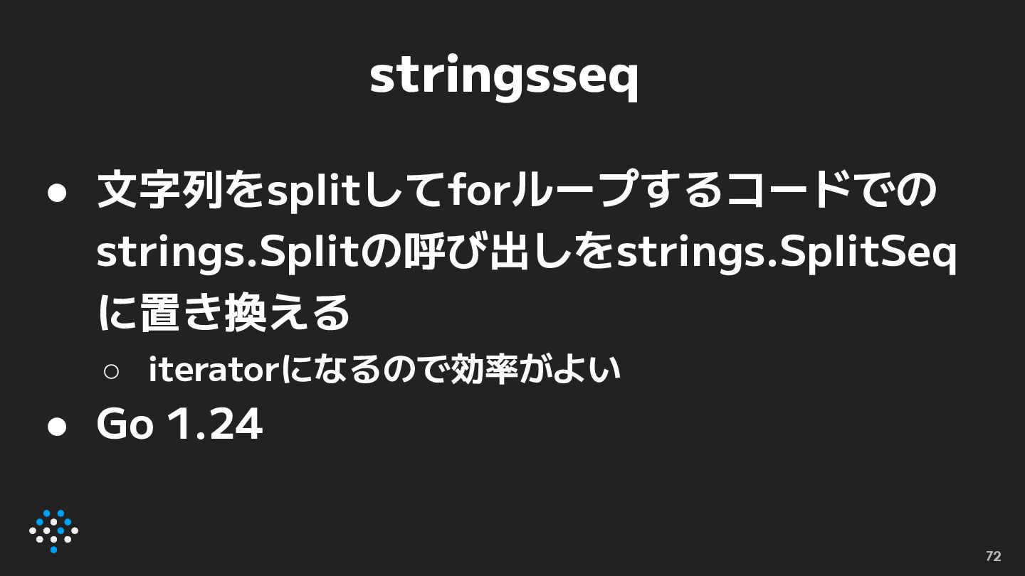 stringsseq • 文字列をsplitしてforループするコードでの strings.Splitの呼び出しをstrings.SplitSeq に置き換える ◦ iteratorになるので効率がよい • Go 1.24
