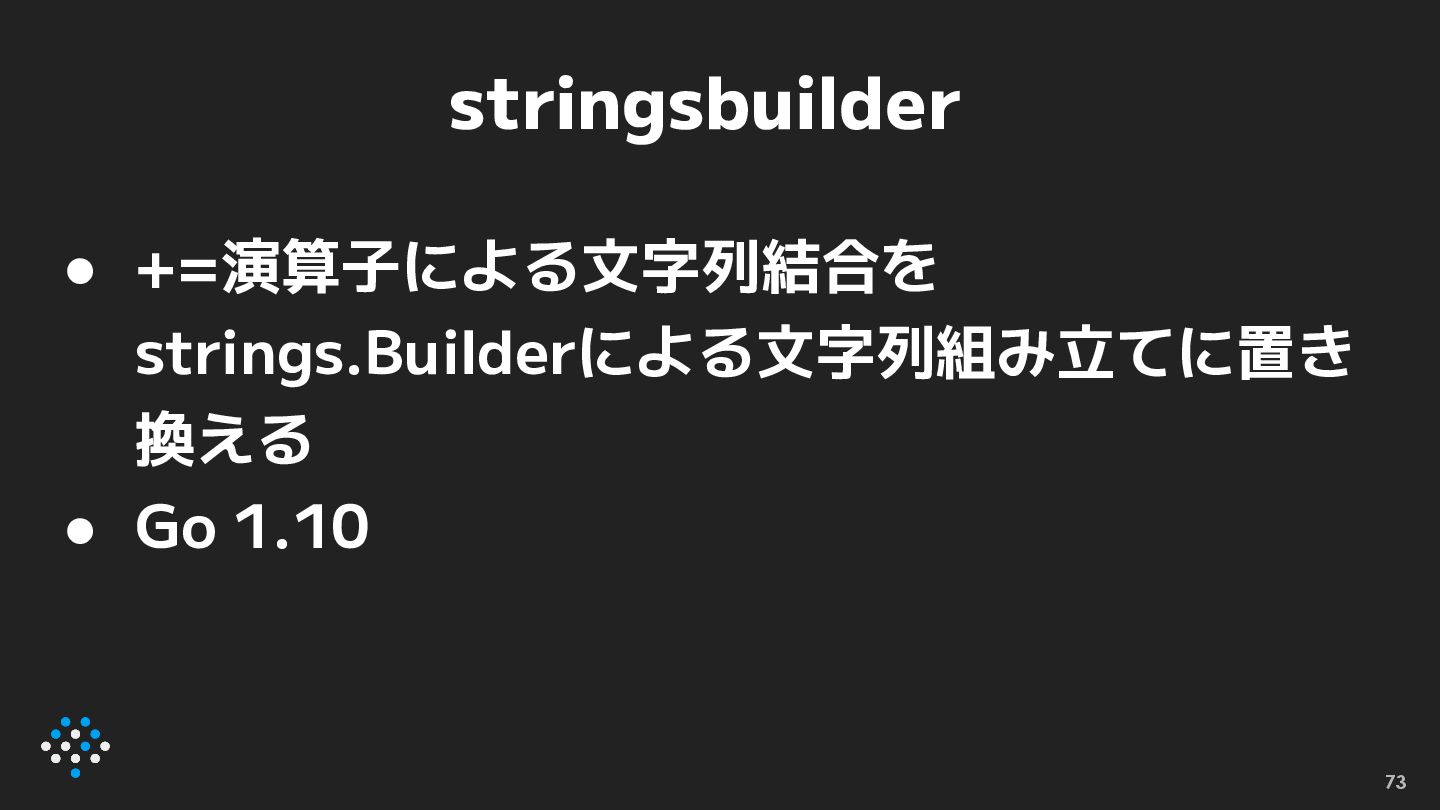 stringsbuilder • +=演算子による文字列結合を strings.Builderによる文字列組み立てに置き 換える • Go 1.10 73