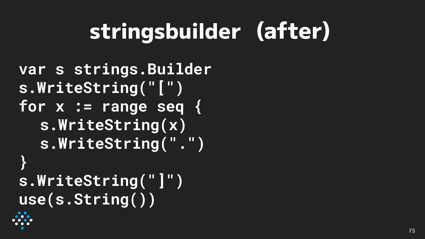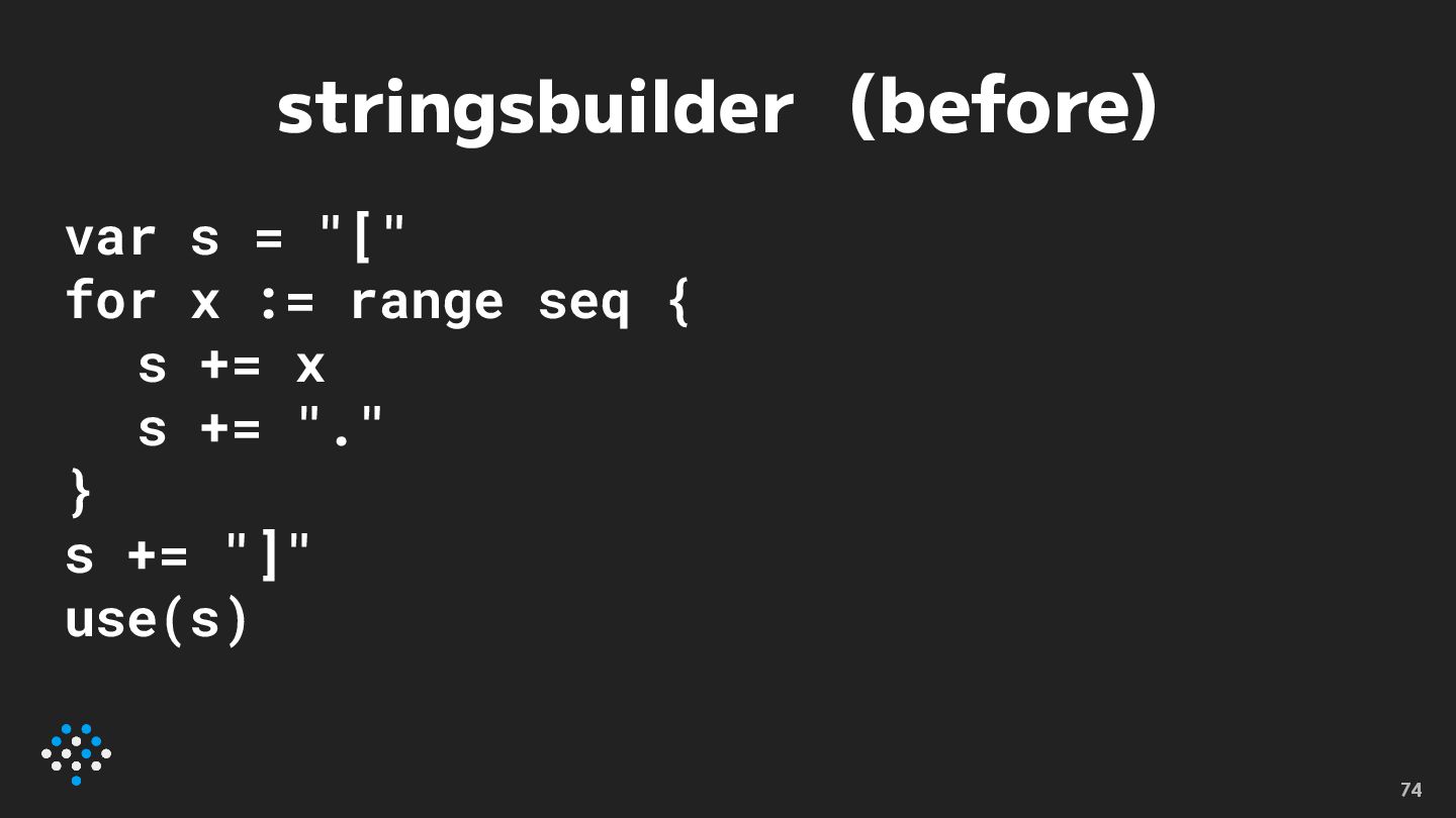 stringsbuilder (after) var s strings.Builder s.WriteString("[") for x := range