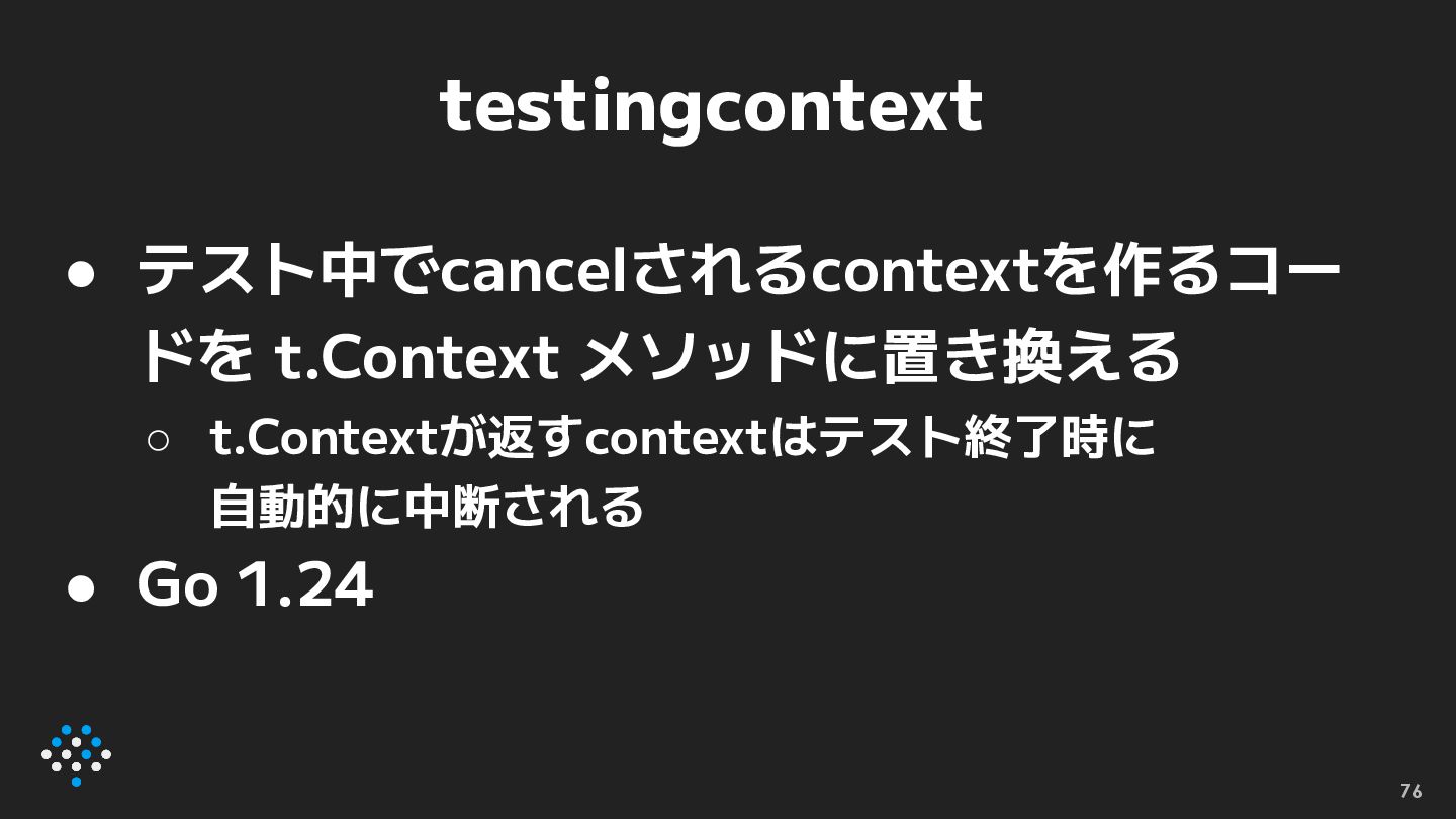 testingcontext • テスト中でcancelされるcontextを作るコー ドを t.Context メソッドに置き換える ◦ t.Contextが返すcontextはテスト終了時に 自動的に中断される •
