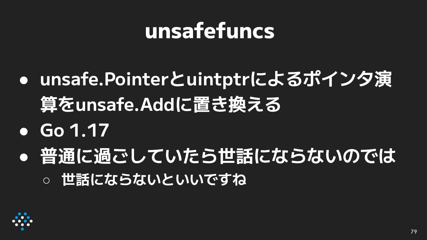 unsafefuncs • unsafe.Pointerとuintptrによるポインタ演 算をunsafe.Addに置き換える • Go 1.17 • 普通に過ごしていたら世話にならないのでは ◦