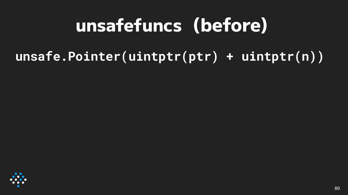 unsafefuncs (before) unsafe.Pointer(uintptr(ptr) + uintptr(n)) 80