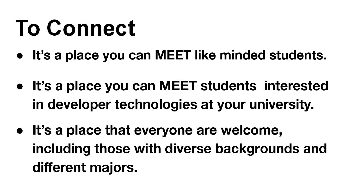 minded students. • It’s a place you can MEET students interested in developer technologies at your university. • It’s a place that everyone are welcome, including those with diverse backgrounds and different majors.