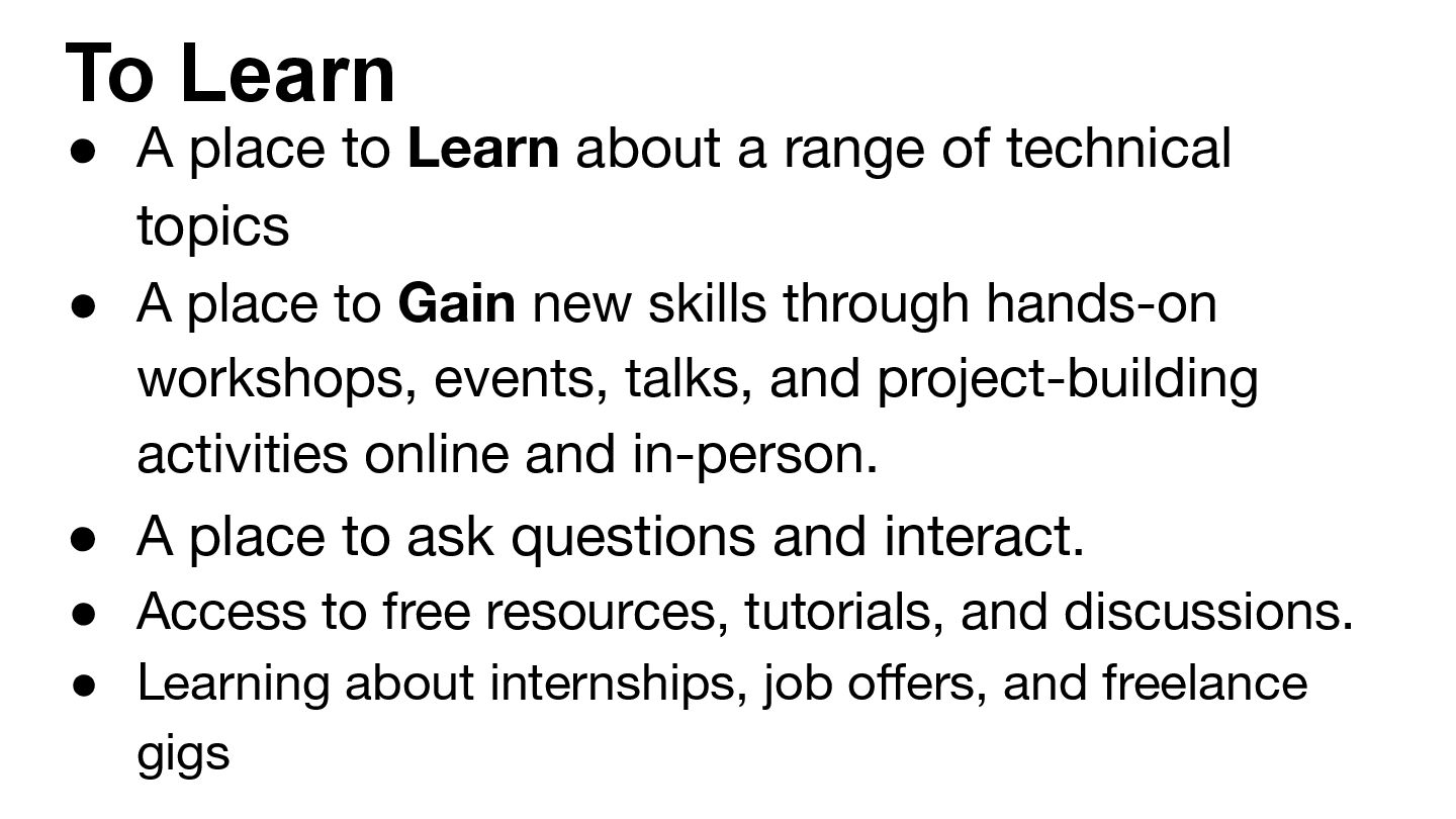 of technical topics • A place to Gain new skills through hands-on workshops, events, talks, and project-building activities online and in-person. • A place to ask questions and interact. • Access to free resources, tutorials, and discussions. • Learning about internships, job offers, and freelance gigs