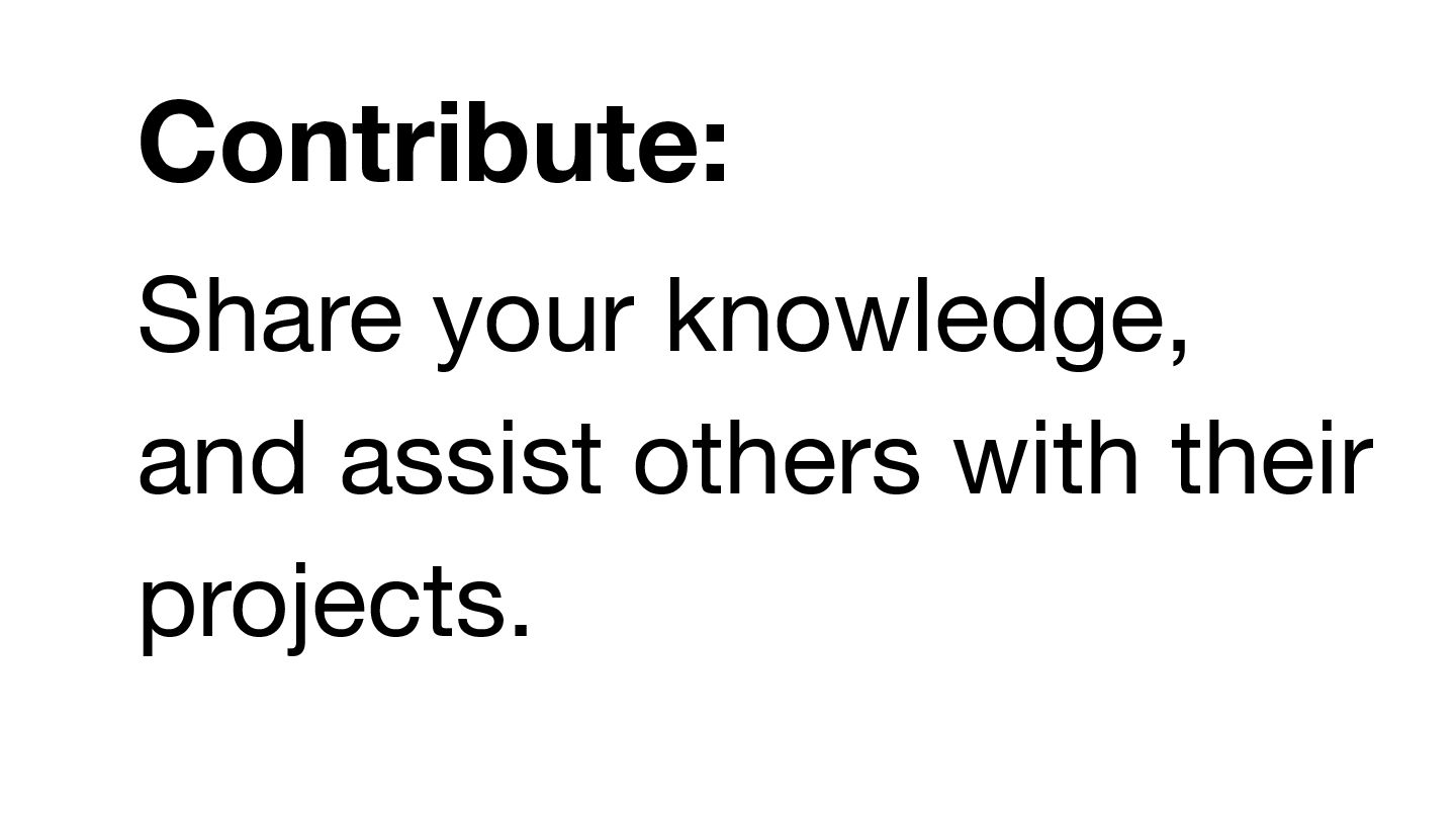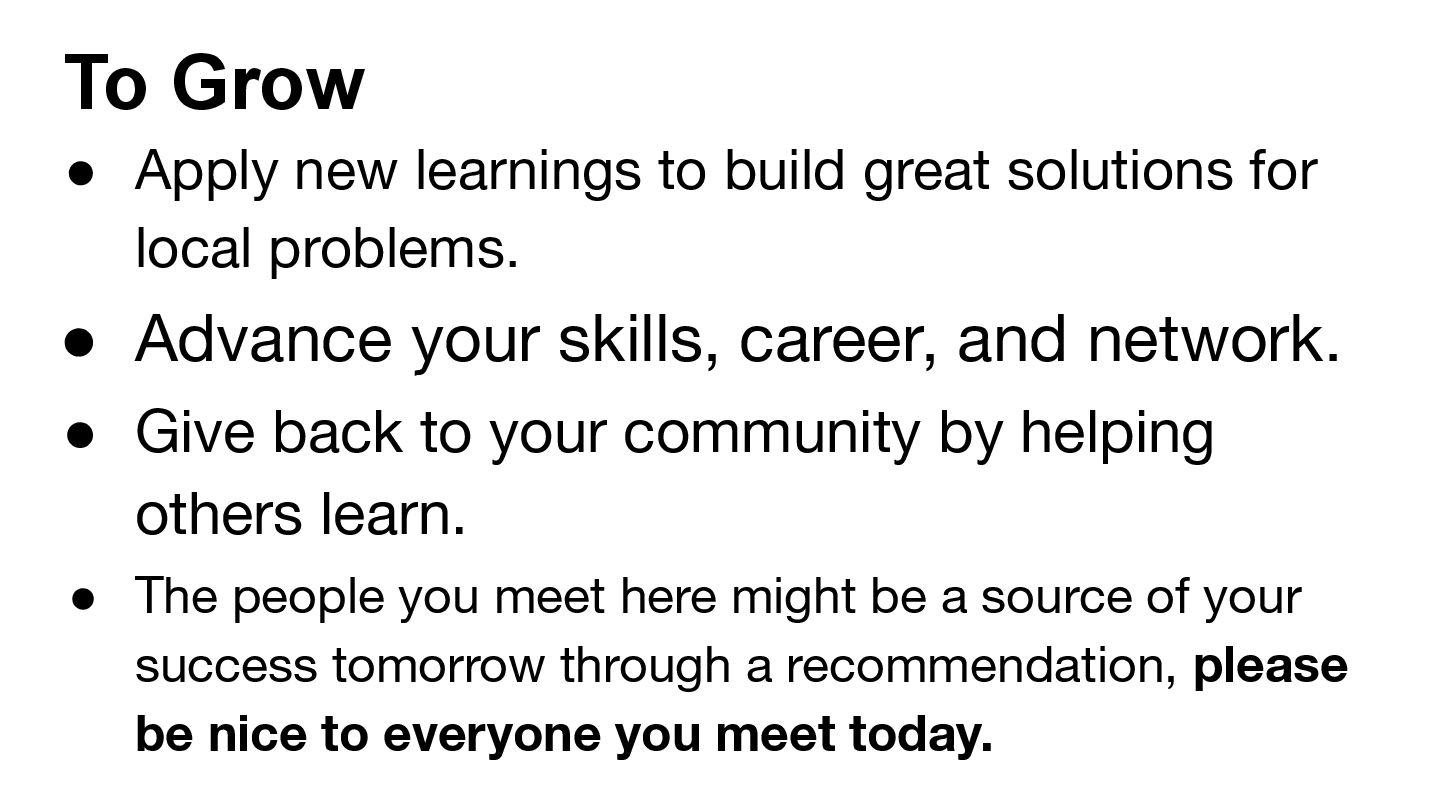 for local problems. • Advance your skills, career, and network. • The people you meet here might be a source of your success tomorrow through a recommendation, please be nice to everyone you meet today. • Give back to your community by helping others learn.