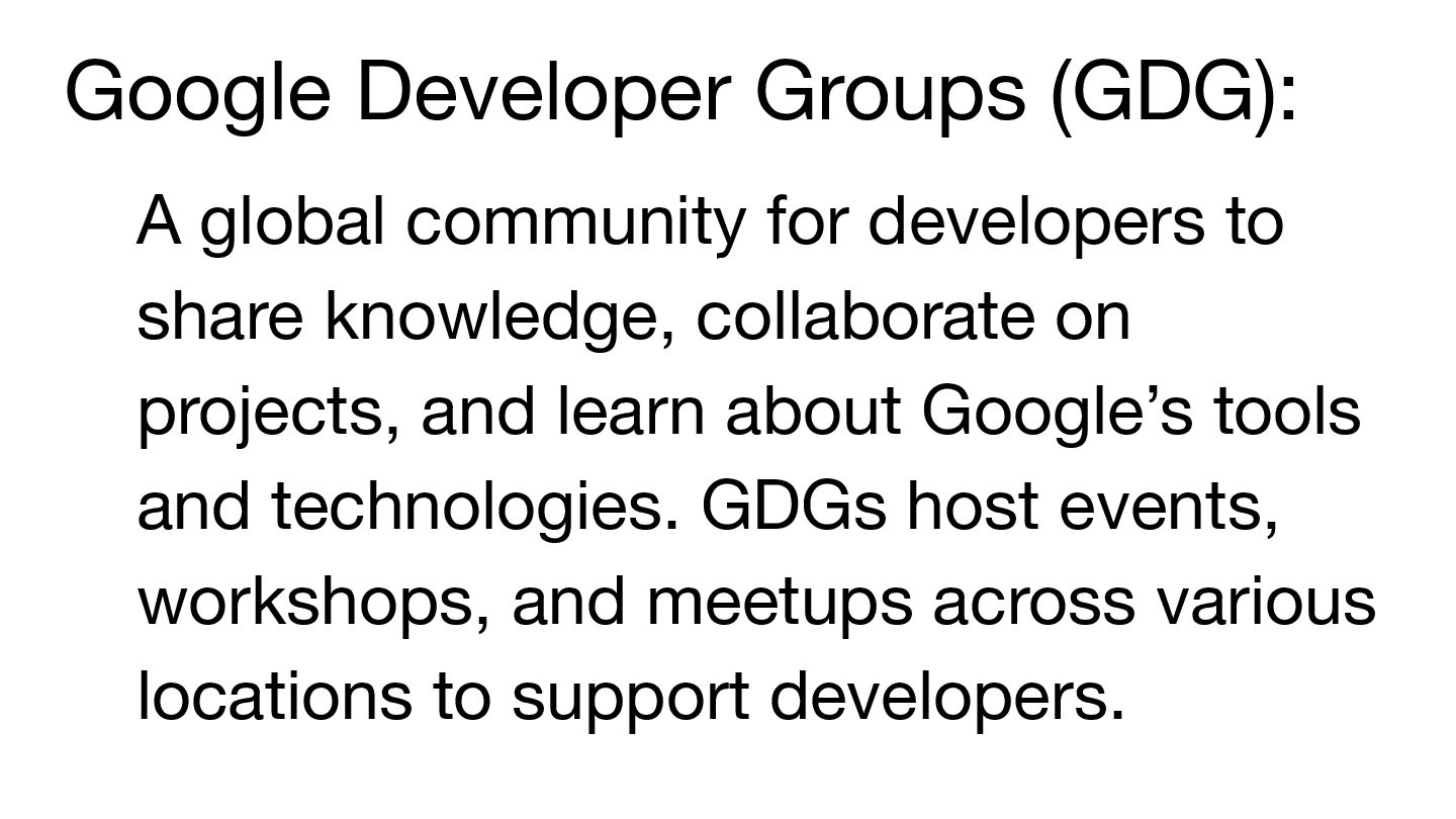 share knowledge, collaborate on projects, and learn about Google’s tools and technologies. GDGs host events, workshops, and meetups across various locations to support developers.