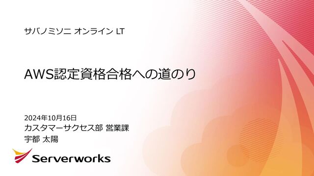 AWS認定資格合格への道のり サバノミソニ オンライン LT カスタマーサクセス部 営業課 宇都 太陽 2024年10月16日