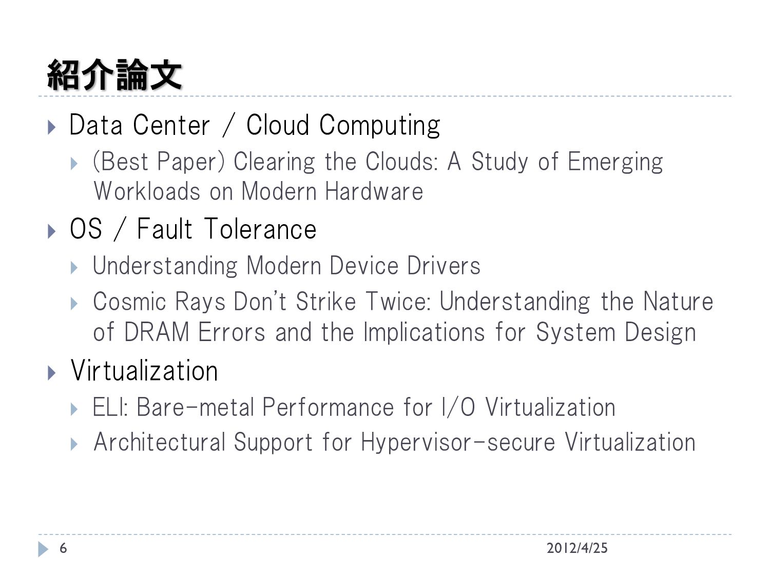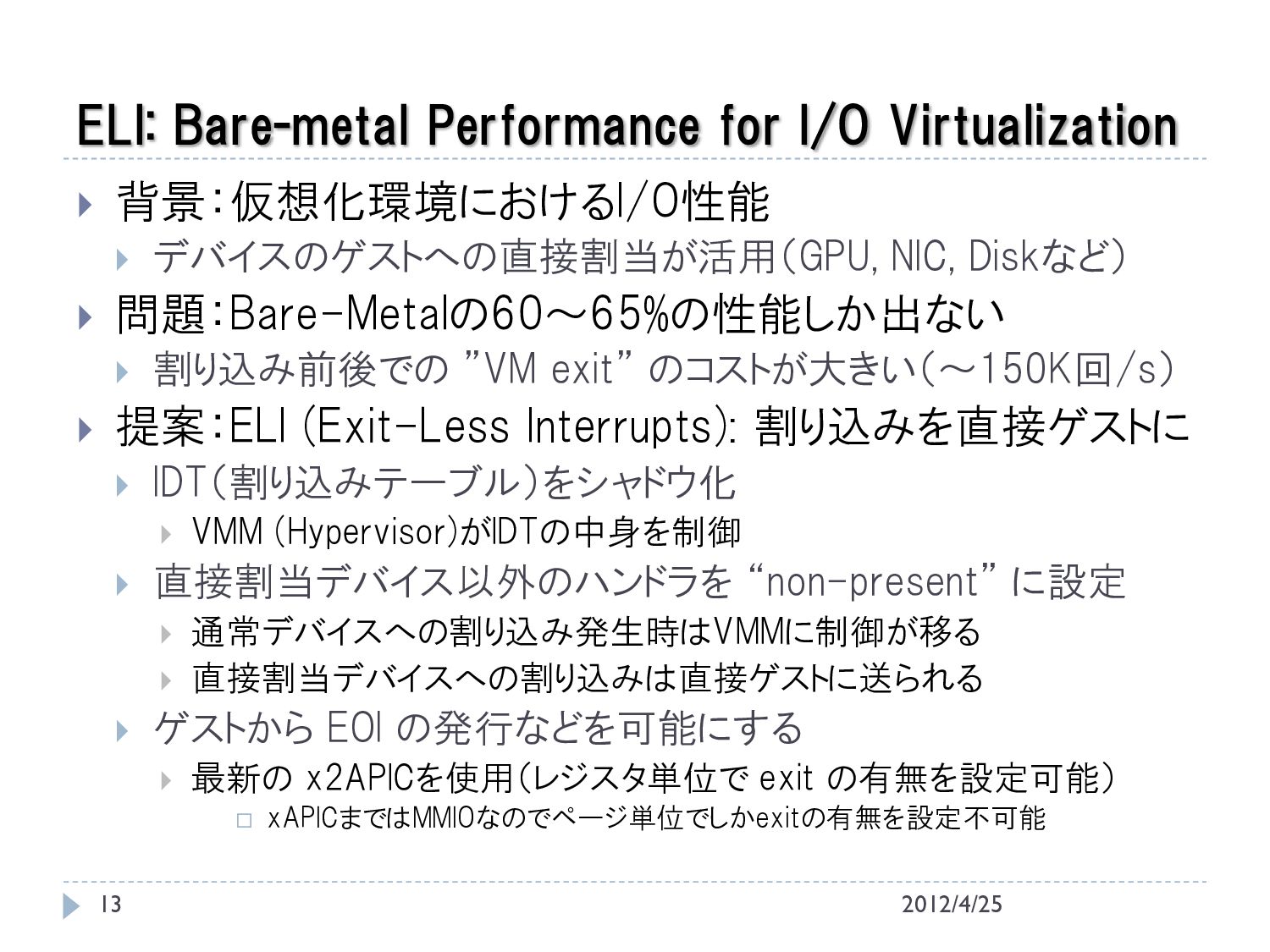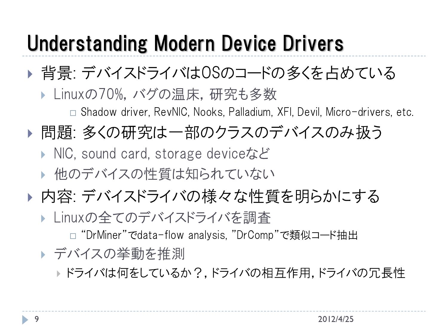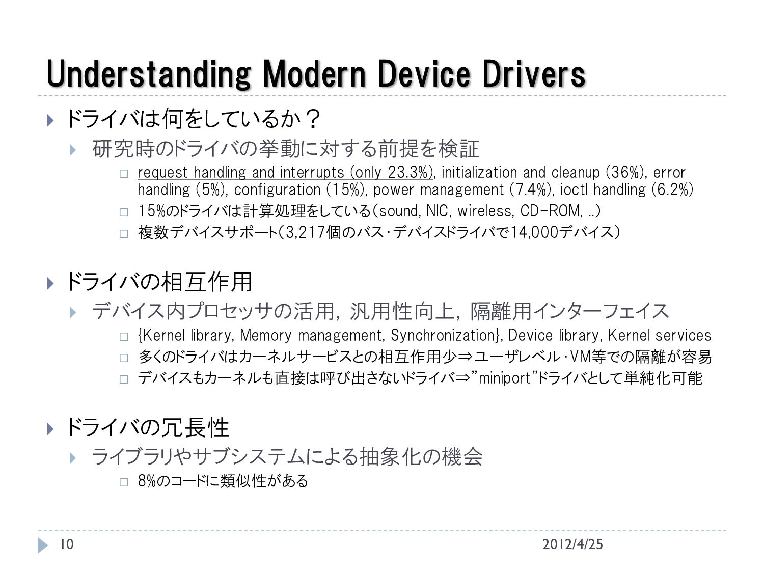 request handling and interrupts (only 23.3%), initialization and cleanup (36%), error handling (5%), configuration (15%), power management (7.4%), ioctl handling (6.2%) 15%のドライバは計算処理をしている(sound, NIC, wireless, CD-ROM, ..) 複数デバイスサポート(3,217個のバス・デバイスドライバで14,000デバイス) ドライバの相互作用 デバイス内プロセッサの活用,汎用性向上,隔離用インターフェイス {Kernel library, Memory management, Synchronization}, Device library, Kernel services 多くのドライバはカーネルサービスとの相互作用少⇒ユーザレベル・VM等での隔離が容易 デバイスもカーネルも直接は呼び出さないドライバ⇒”miniport”ドライバとして単純化可能 ドライバの冗長性 ライブラリやサブシステムによる抽象化の機会 8%のコードに類似性がある